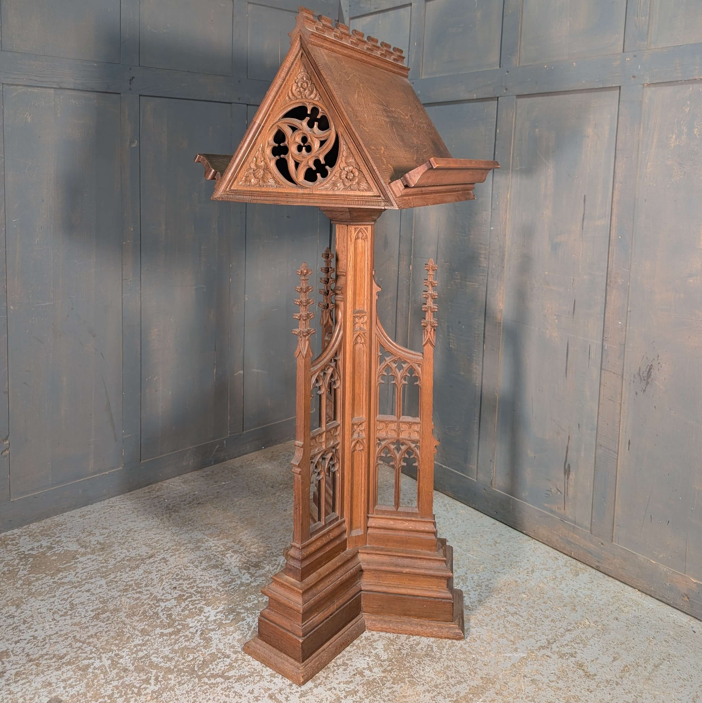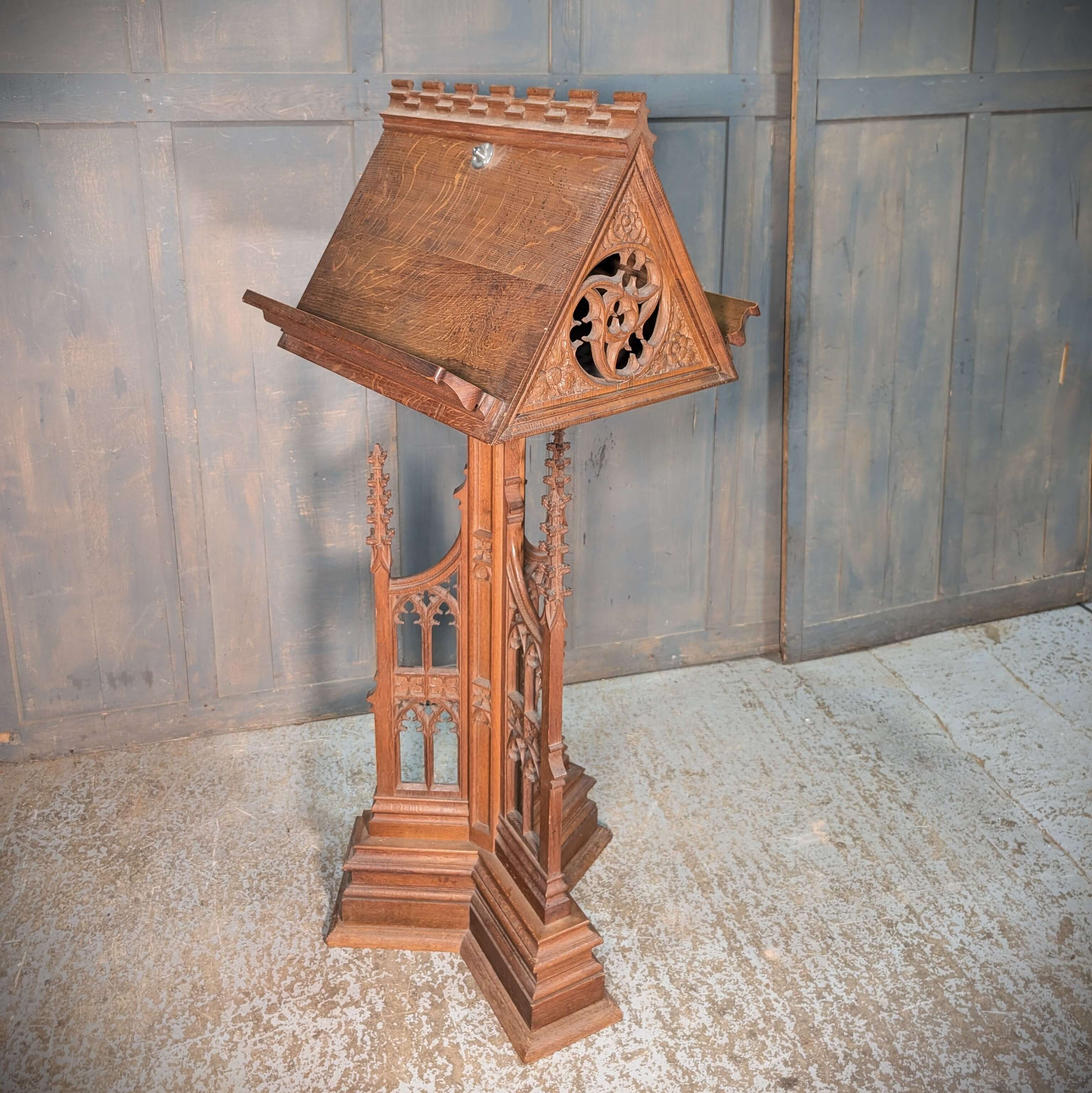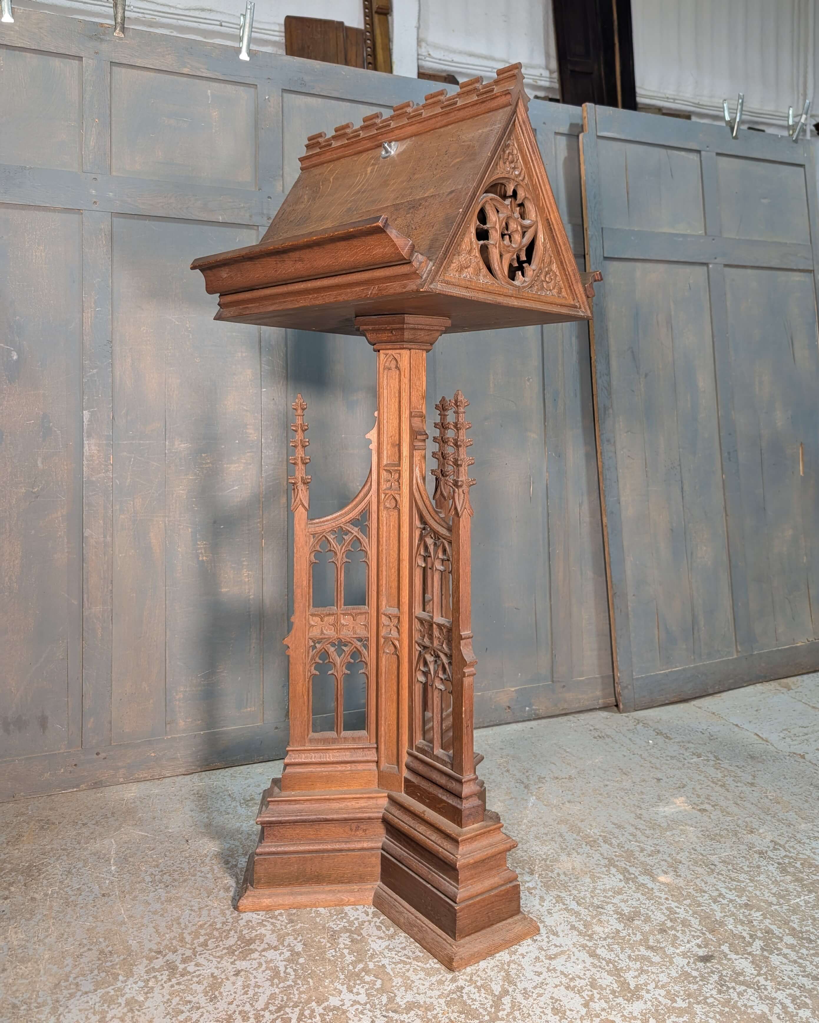 Our product shown on this page 1930’s Vintage Highly Carved Gothic Oak ‘Pigeon Coop’ Church Lectern is currently available for hire.