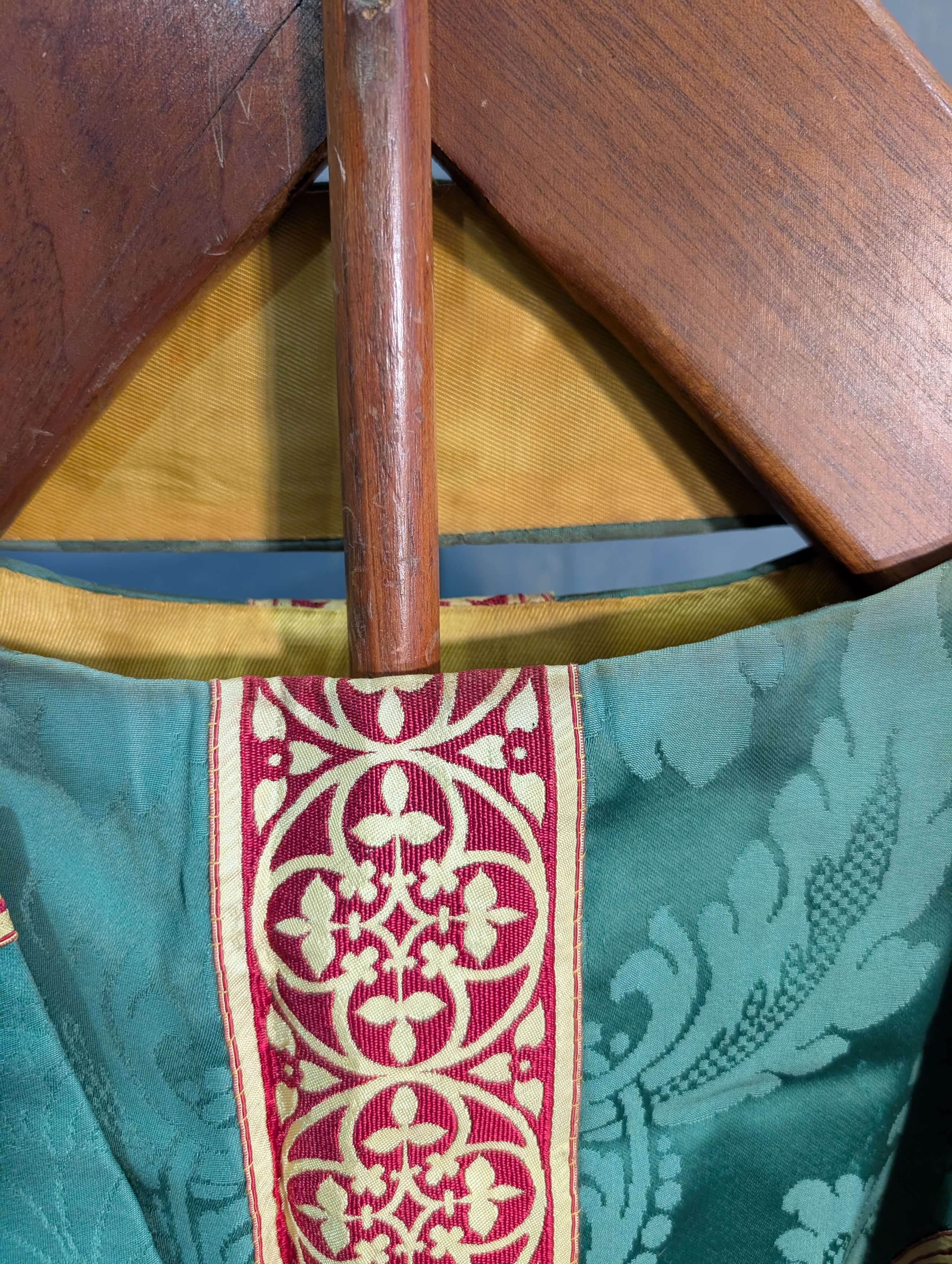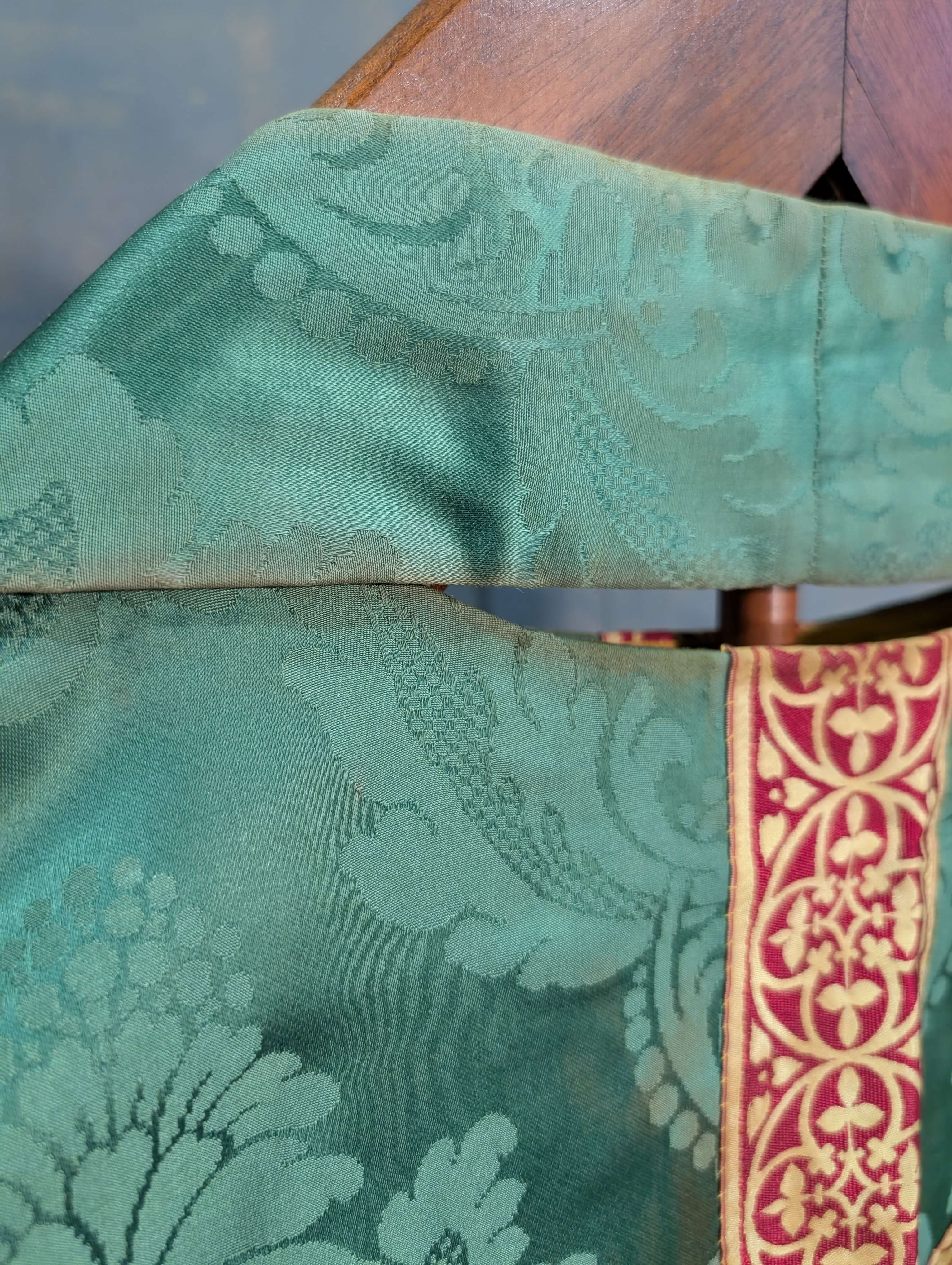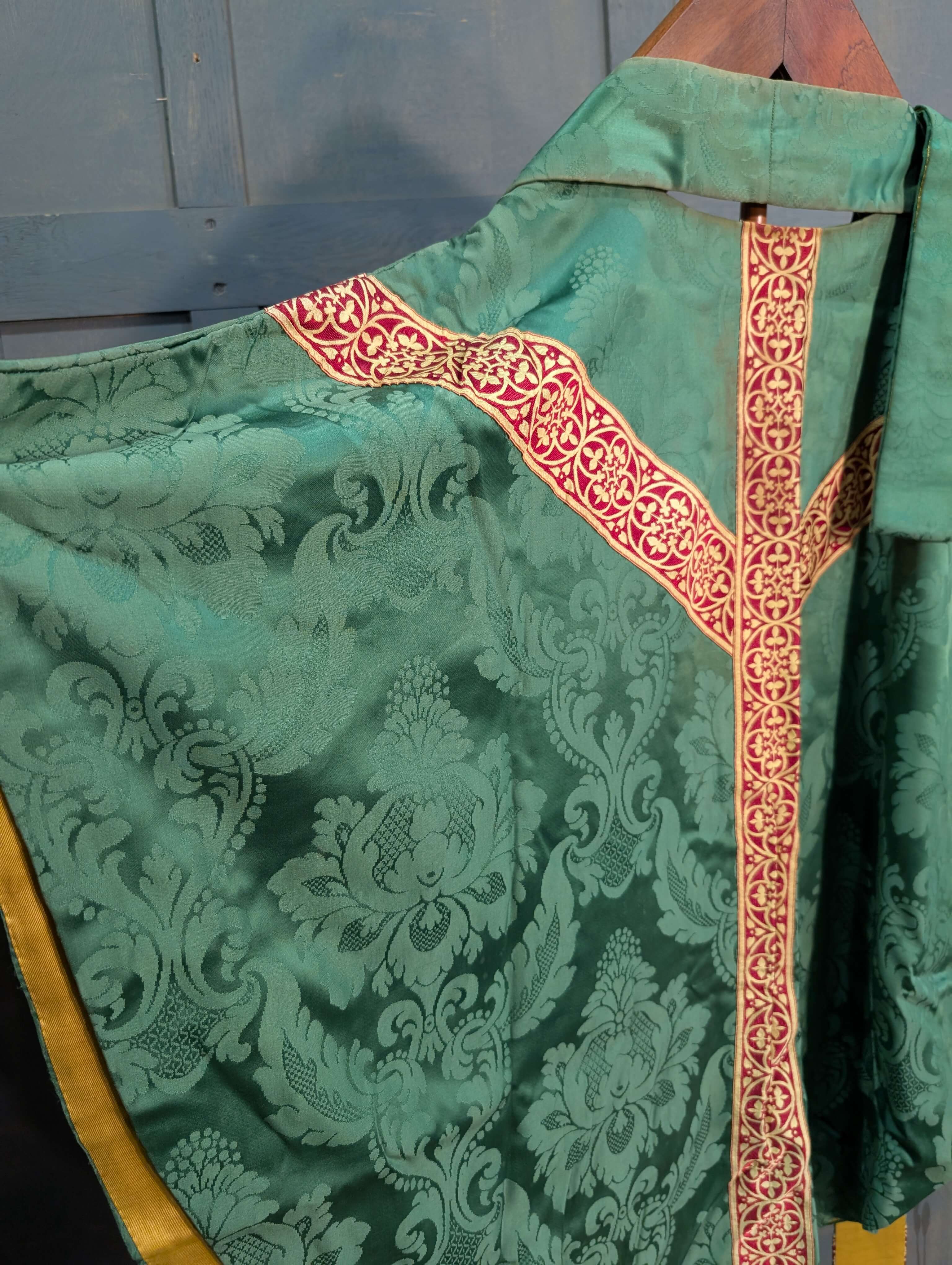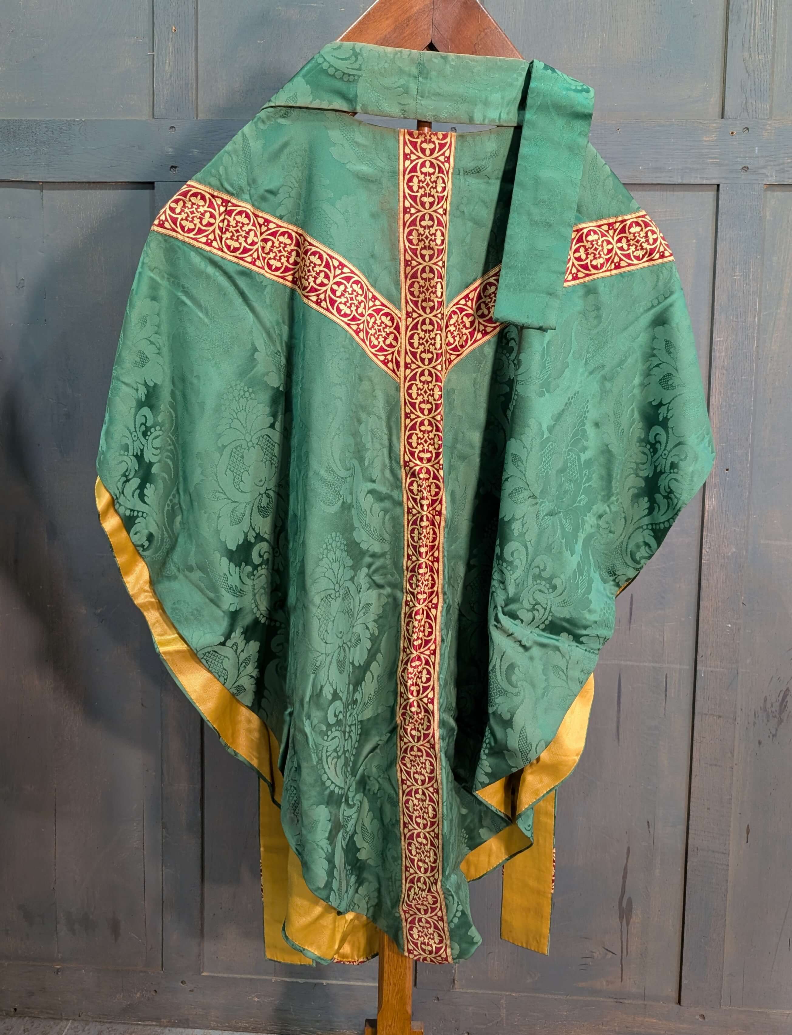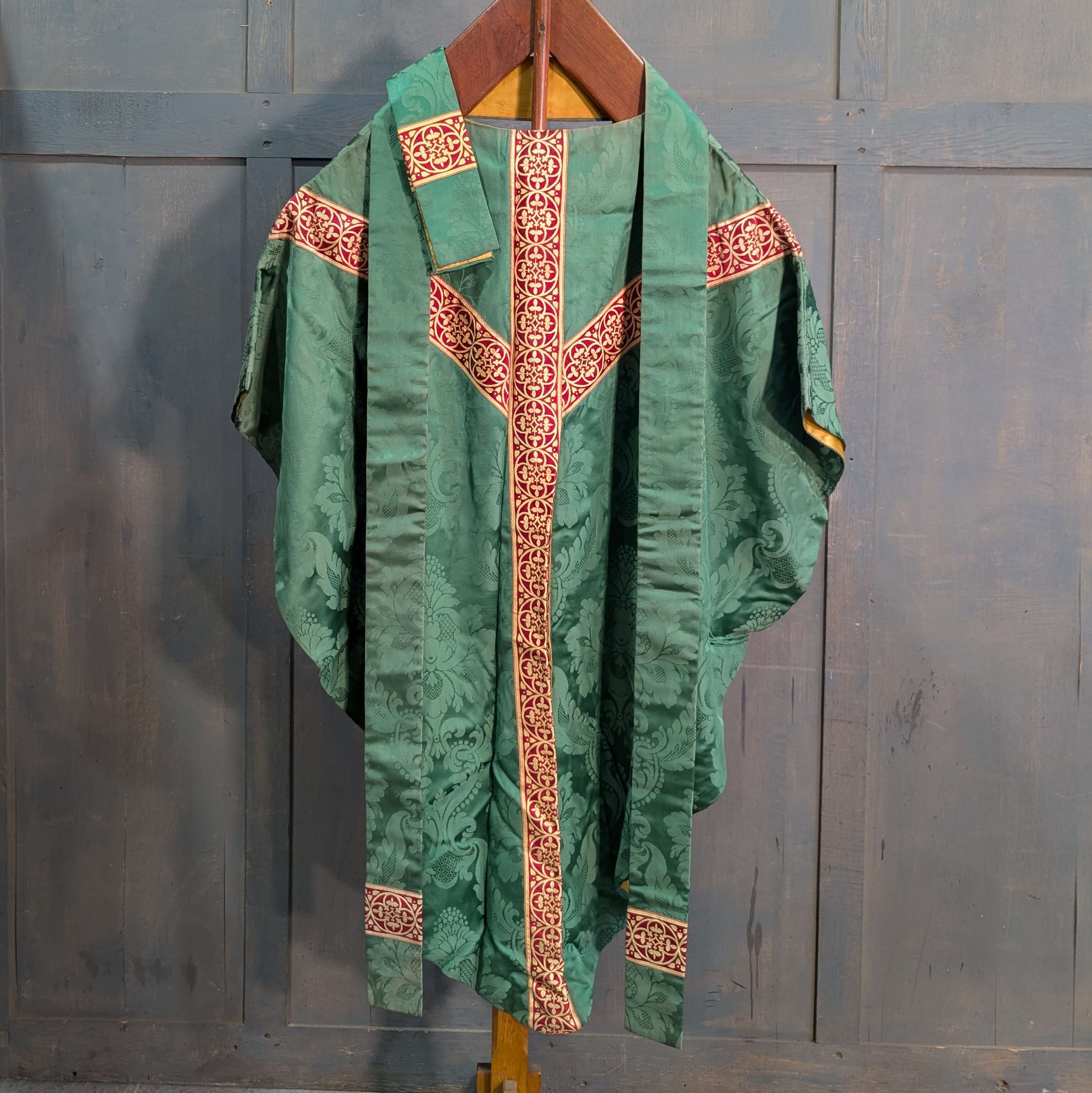 Our product shown on this page Attractive & Verdant Green Damask Silk Chasuble with Red Gold Orphreys & Stole is currently available for hire.