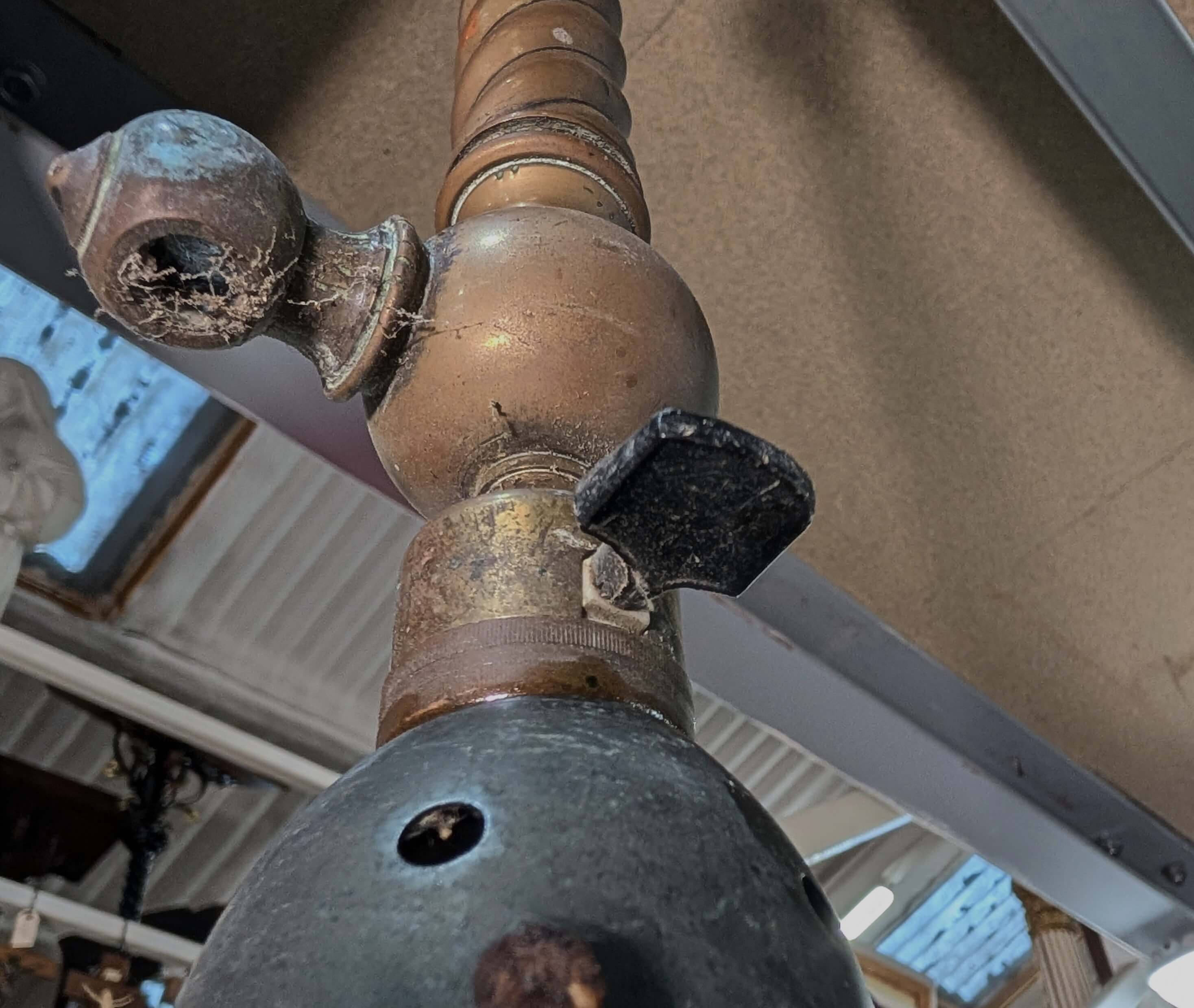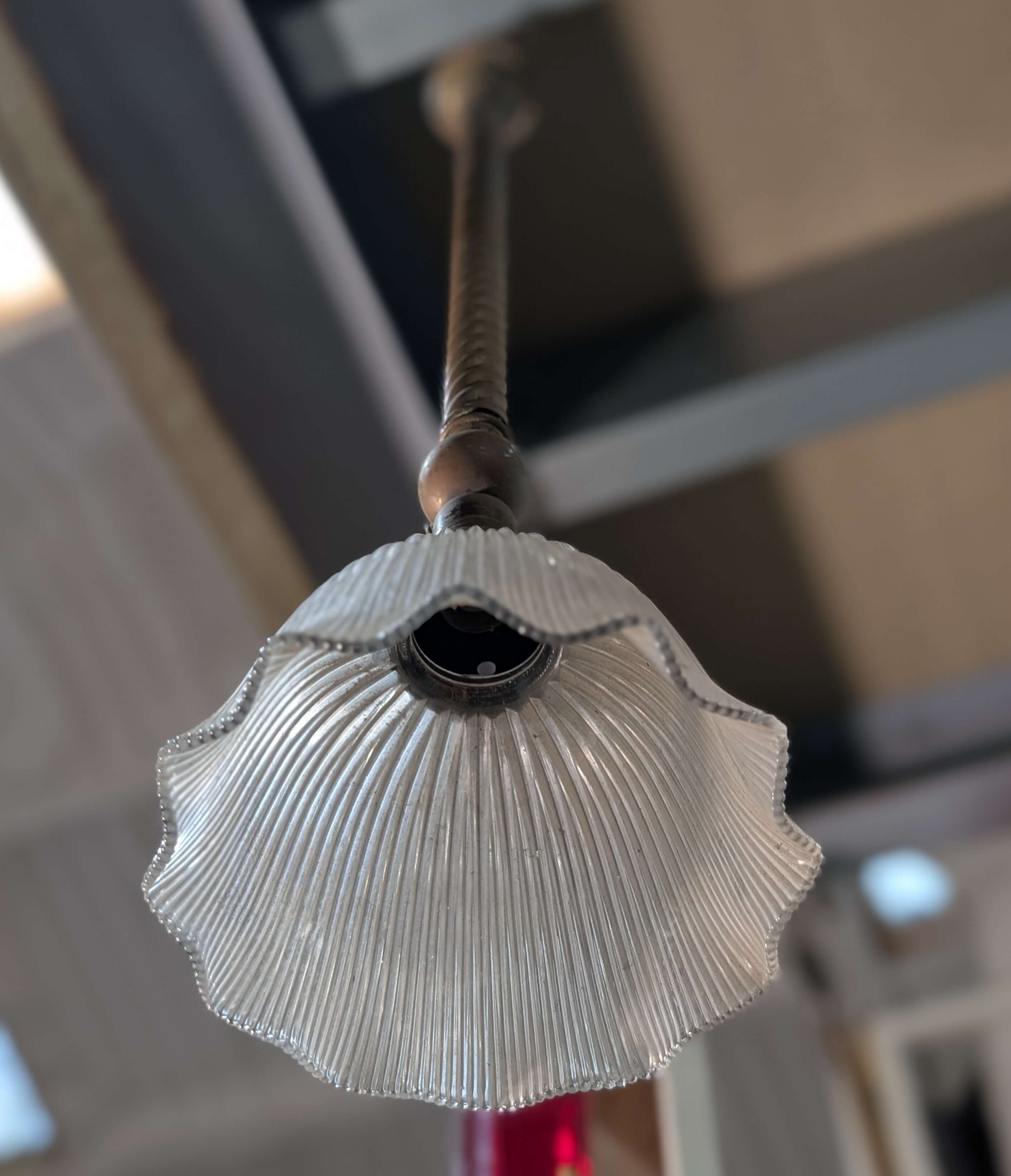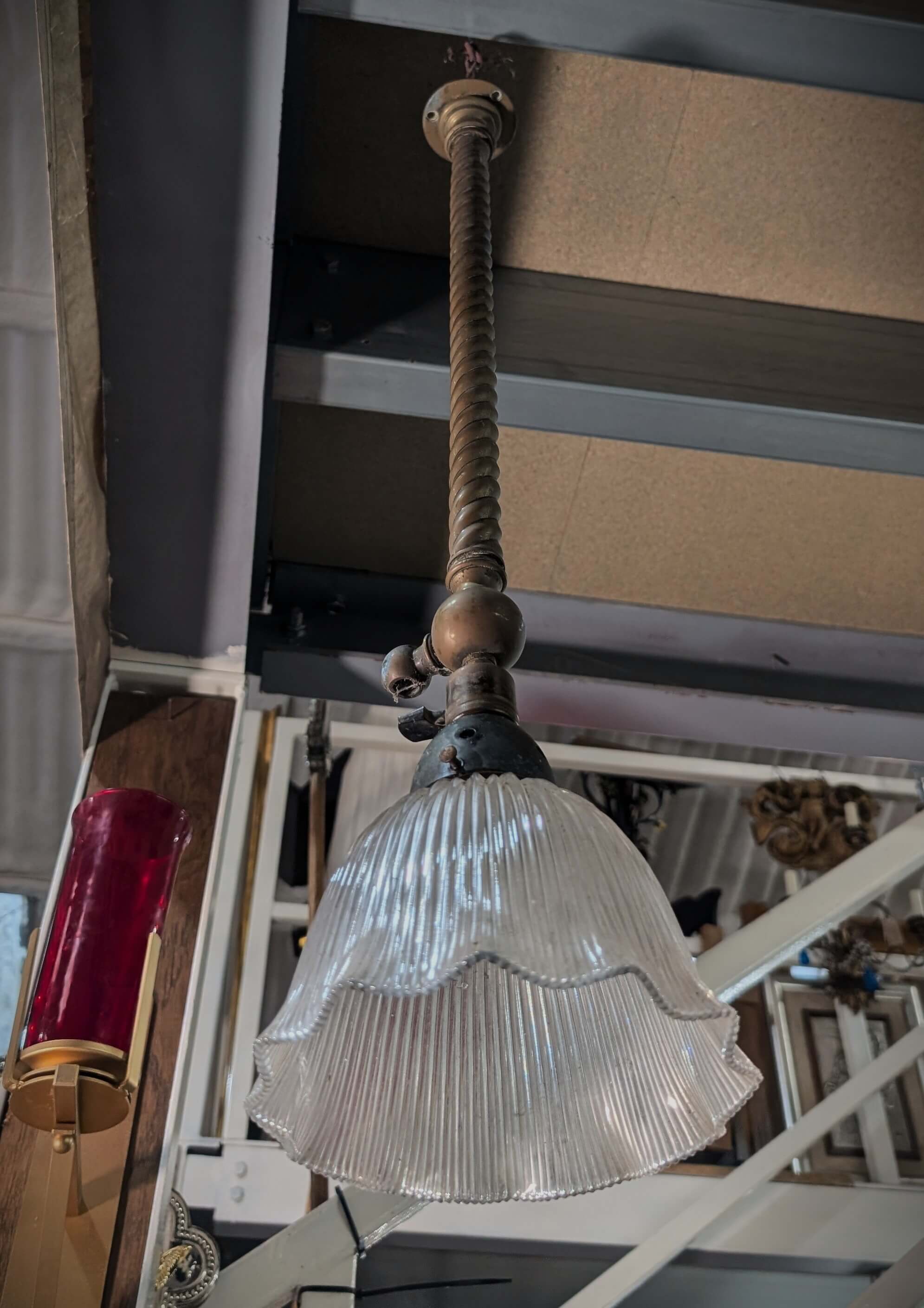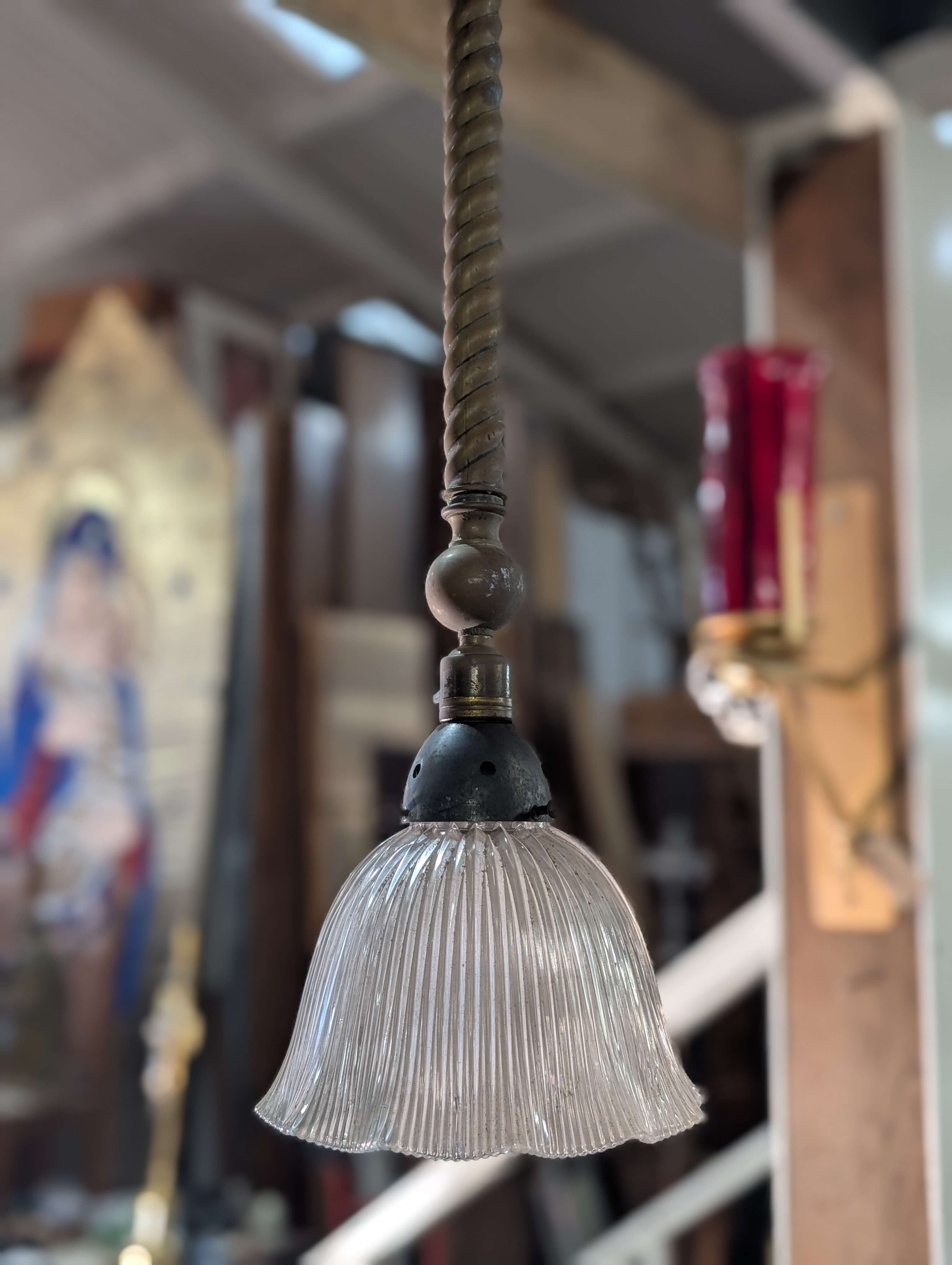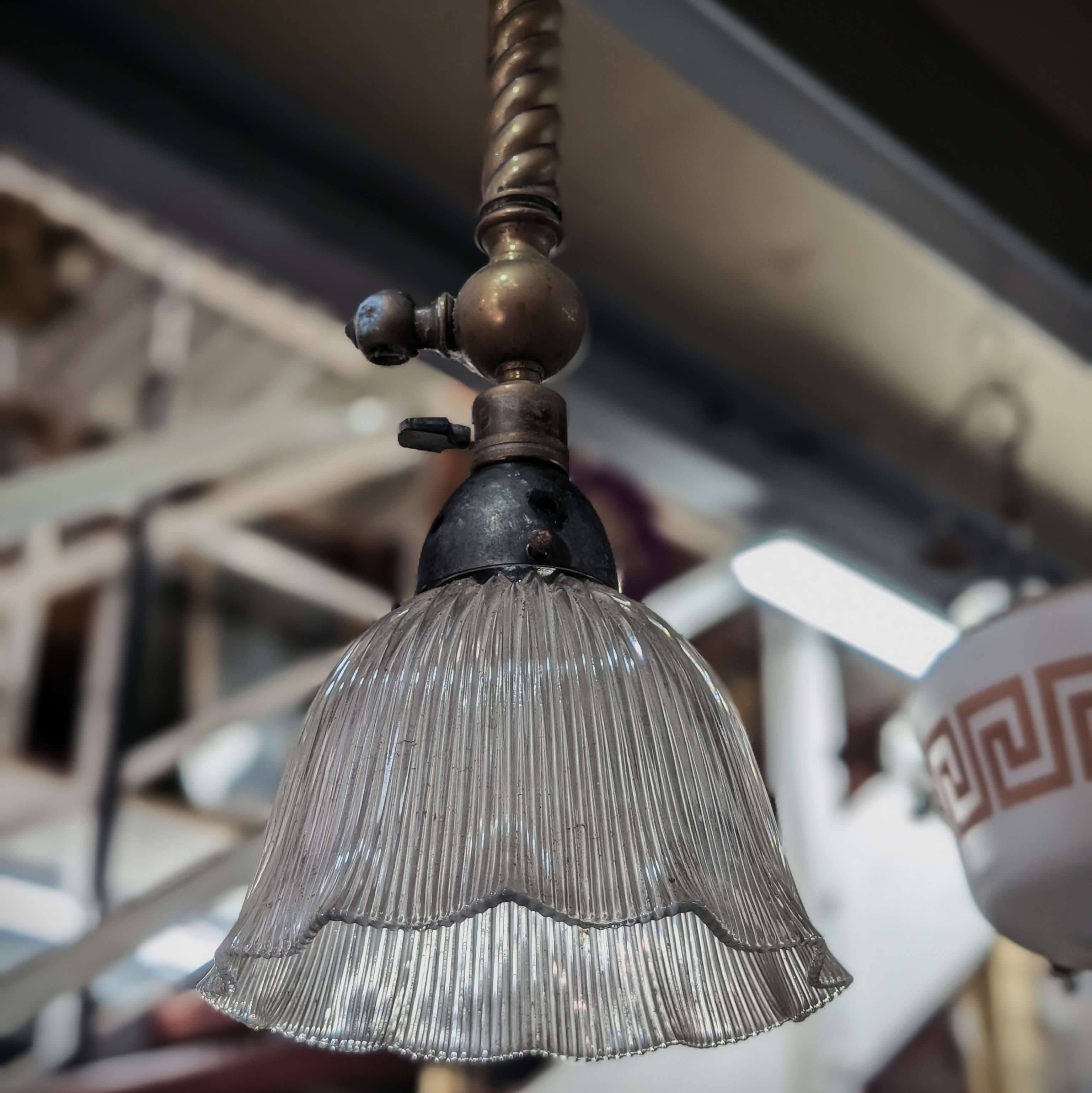 Our product shown on this page Converted from Gas Antique 1909 Genuine Holophane Prismatic Shades with Brass Holders is currently available for hire.
