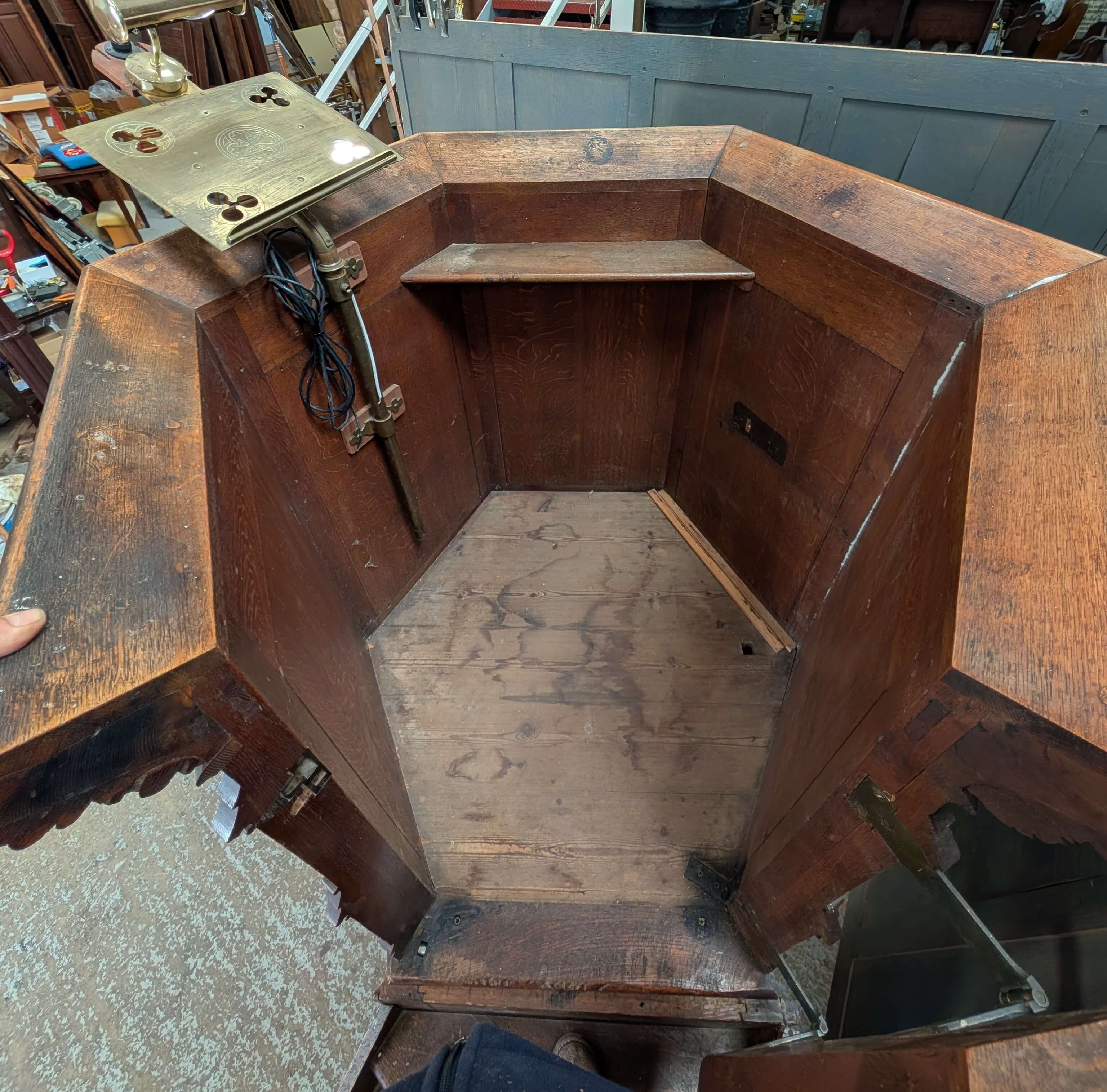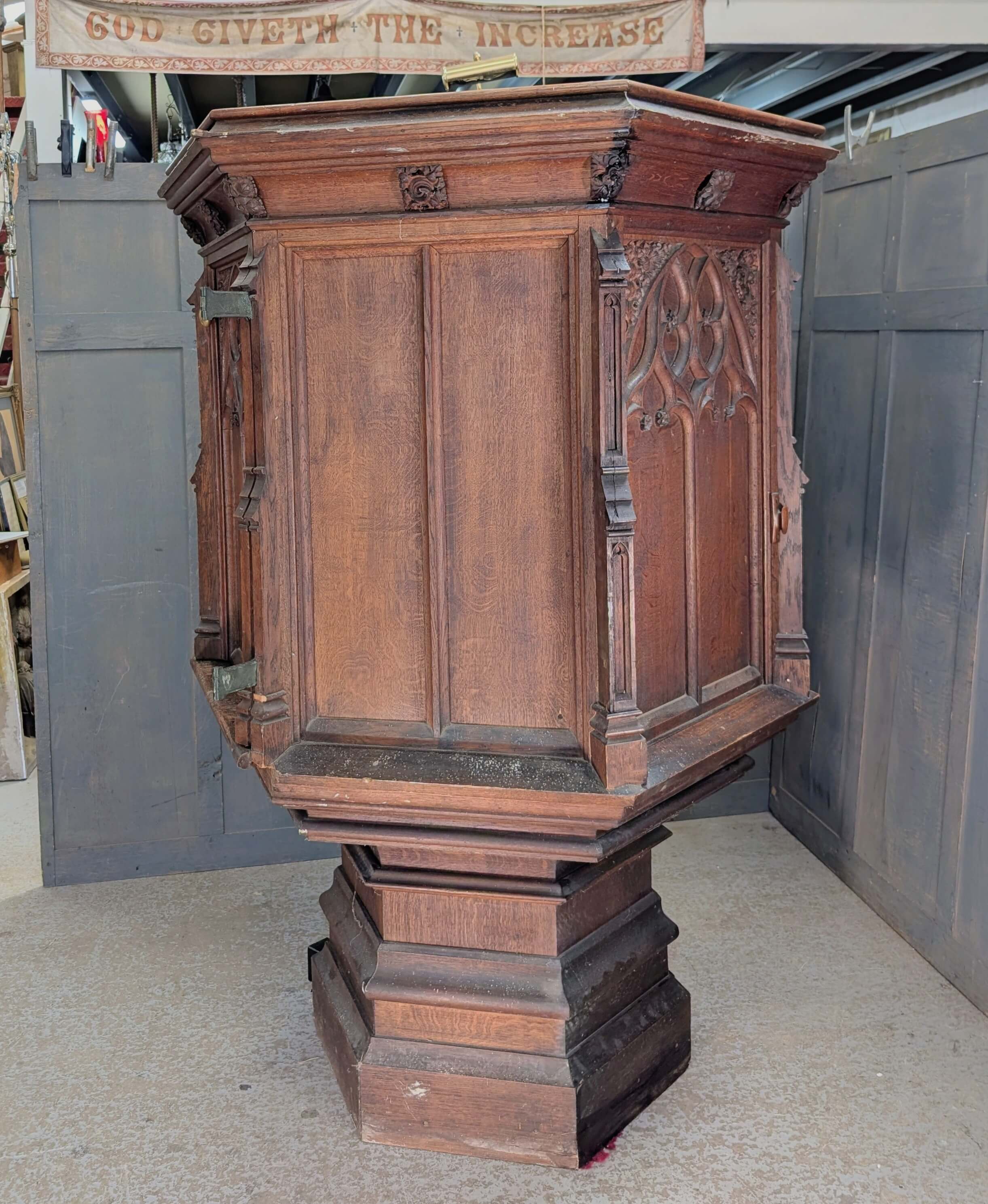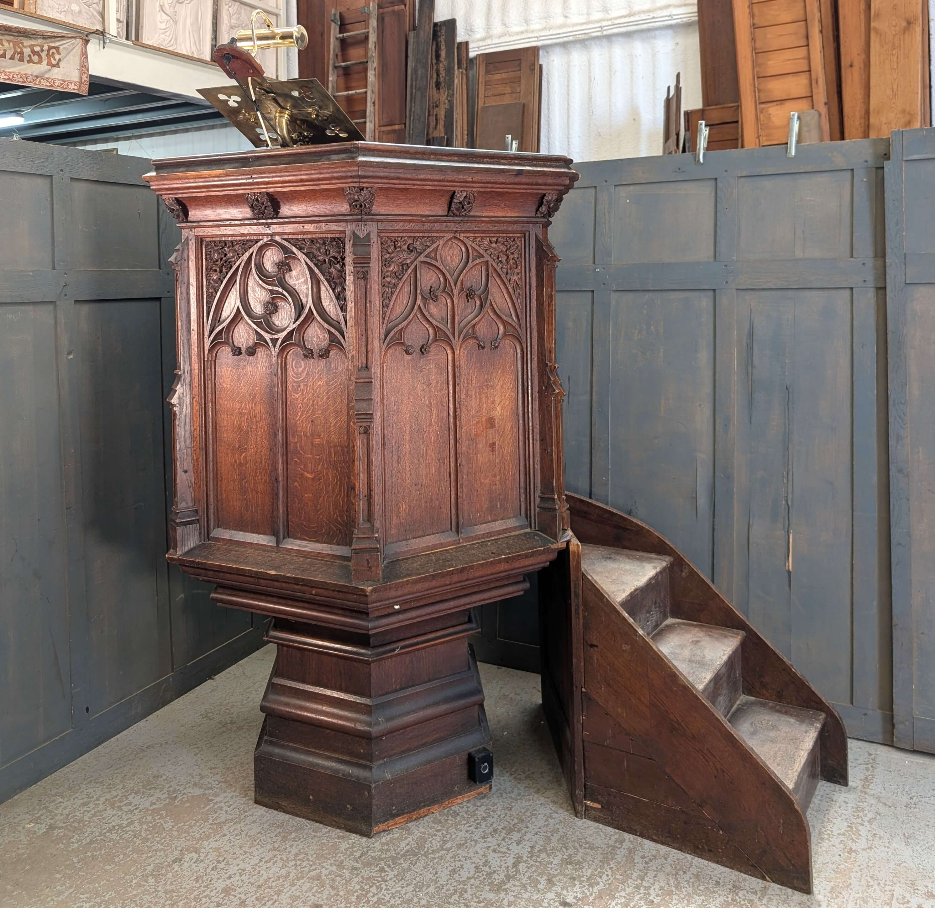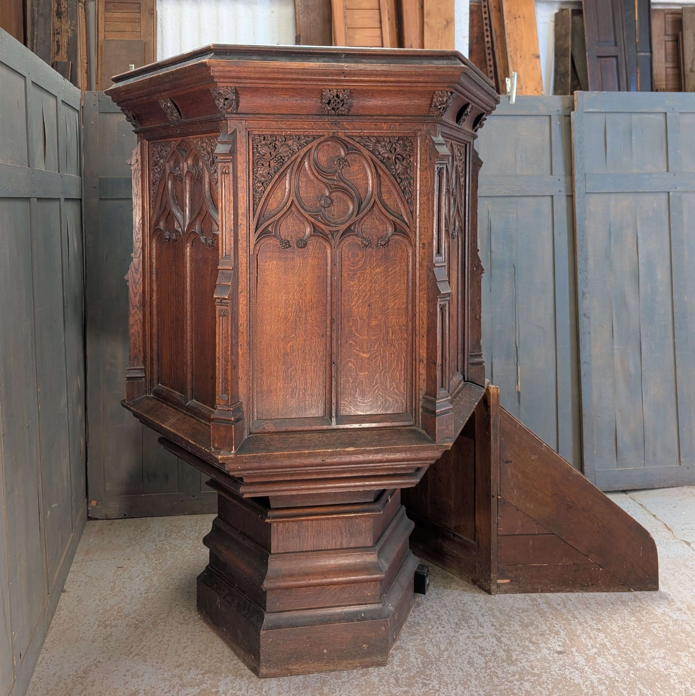 Our product shown on this page Excellent 1850’s Gothic Revival Oak ‘Chalice’ Pulpit from St Lawrence Bovingdon is currently available for hire.