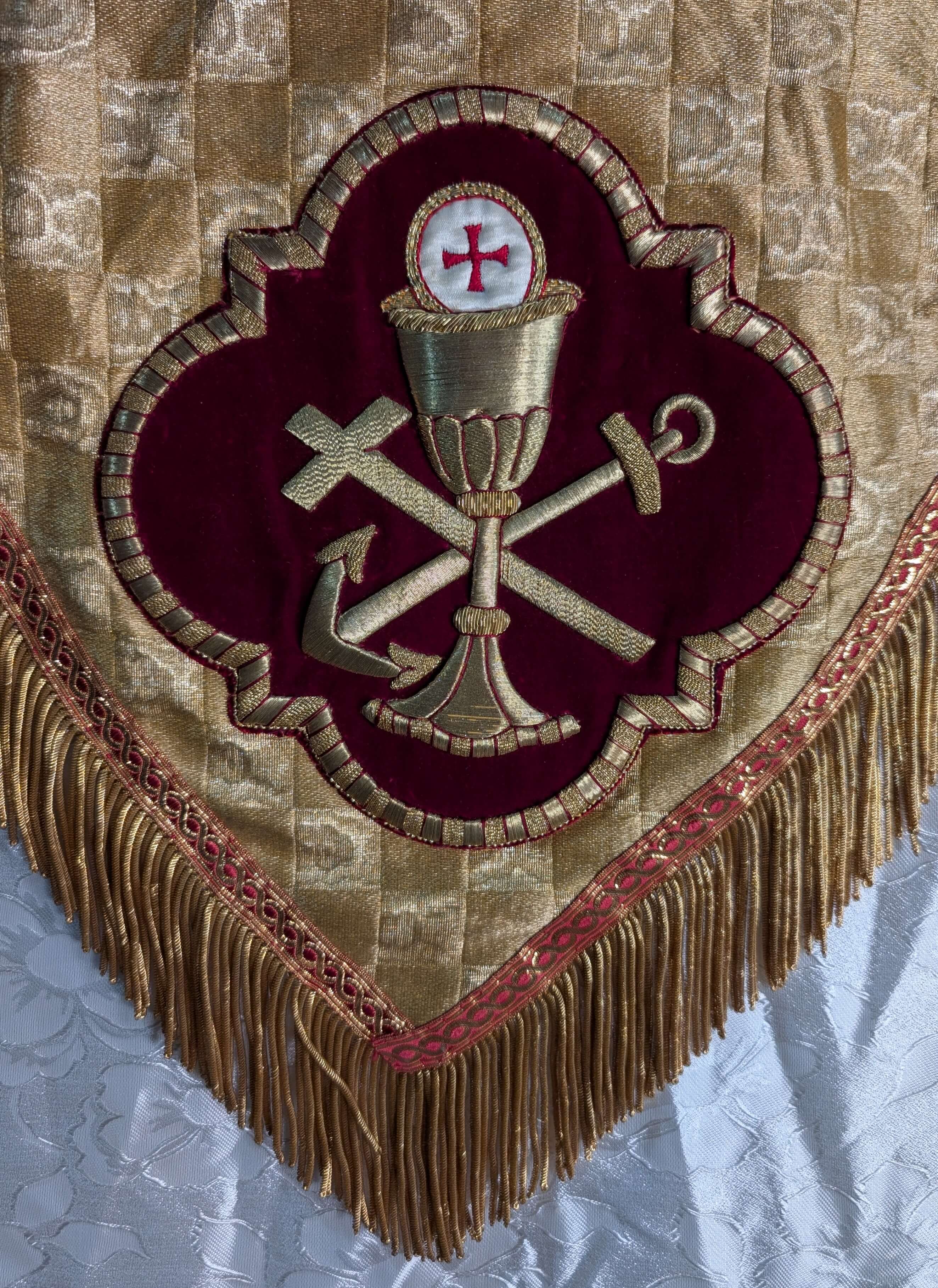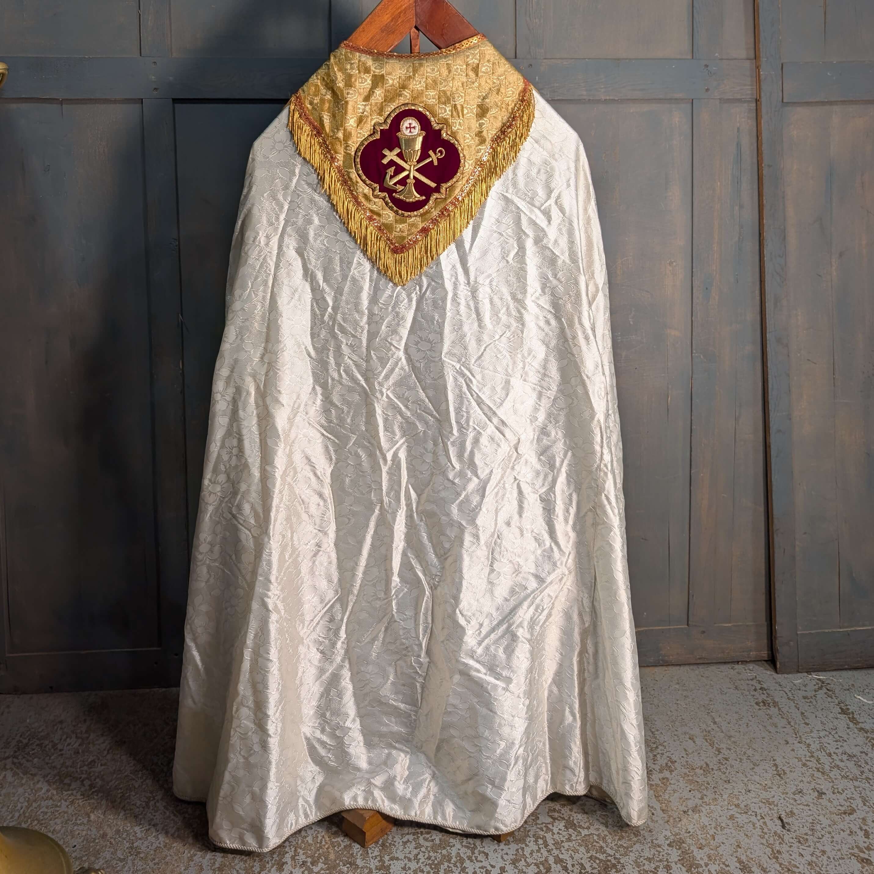 From a closed convent in London which has given us probably the best embroidery collection we have. Collar and hem slightly marked, otherwise in good order. Bullion fringe and chalice.