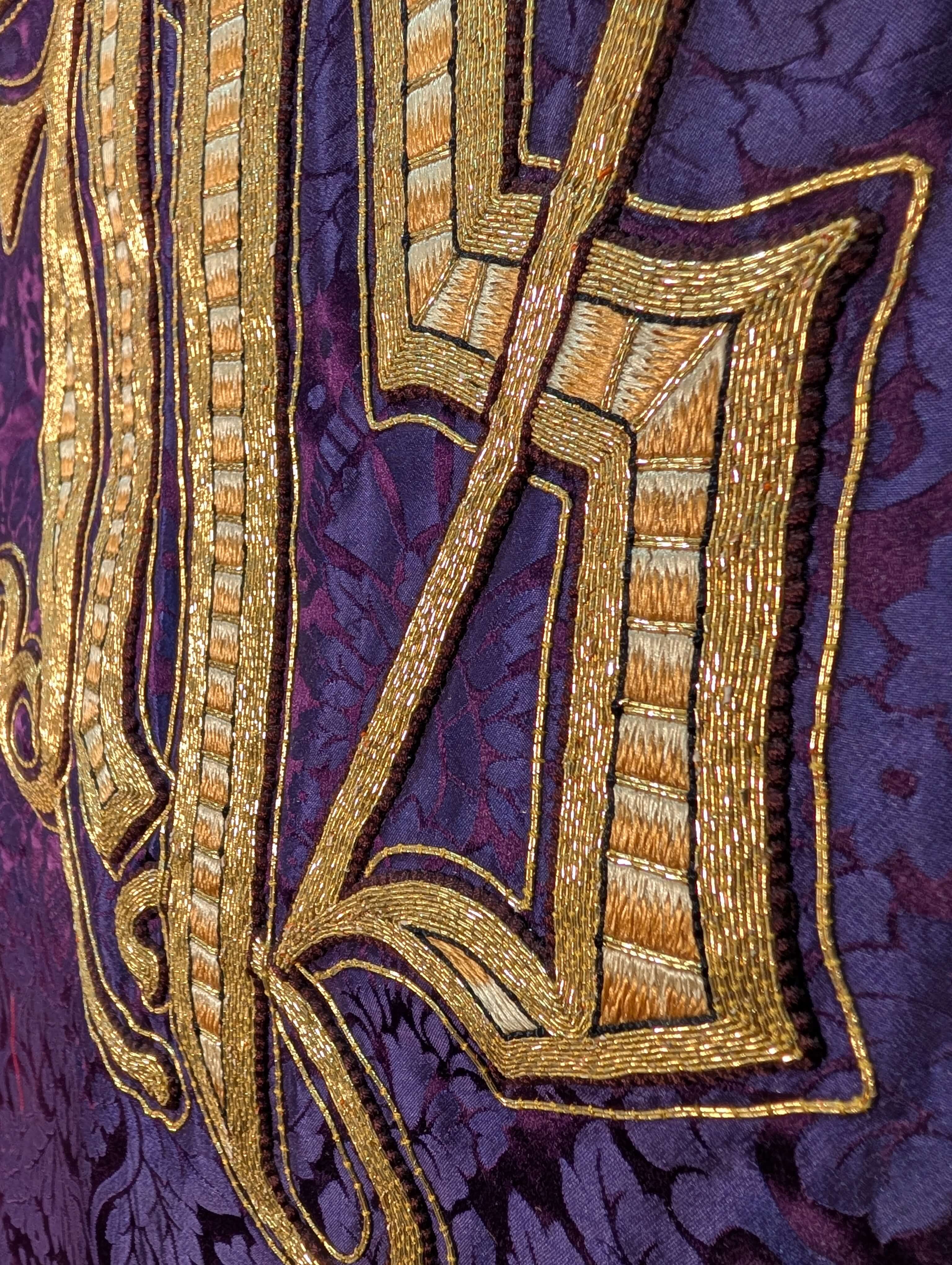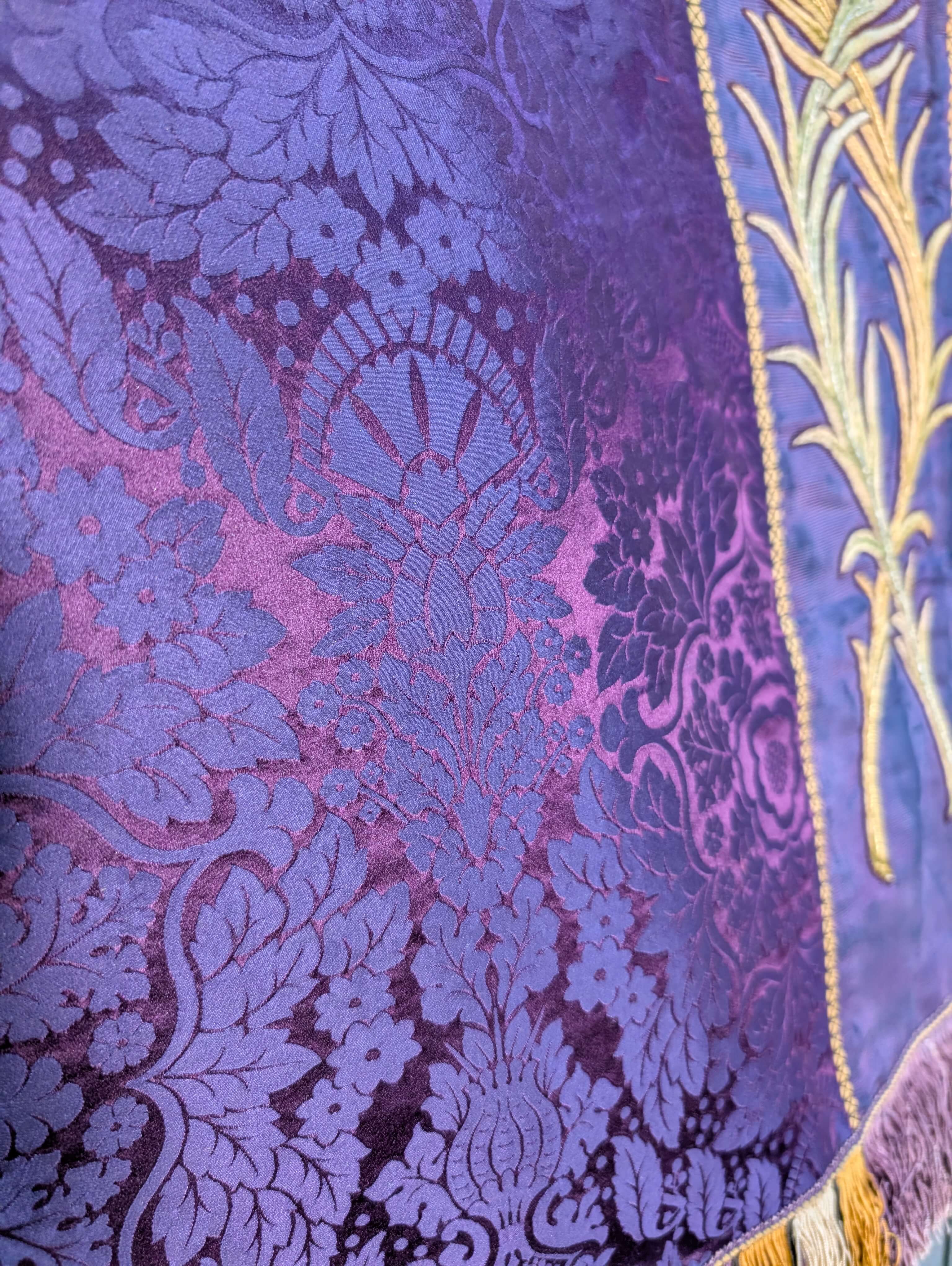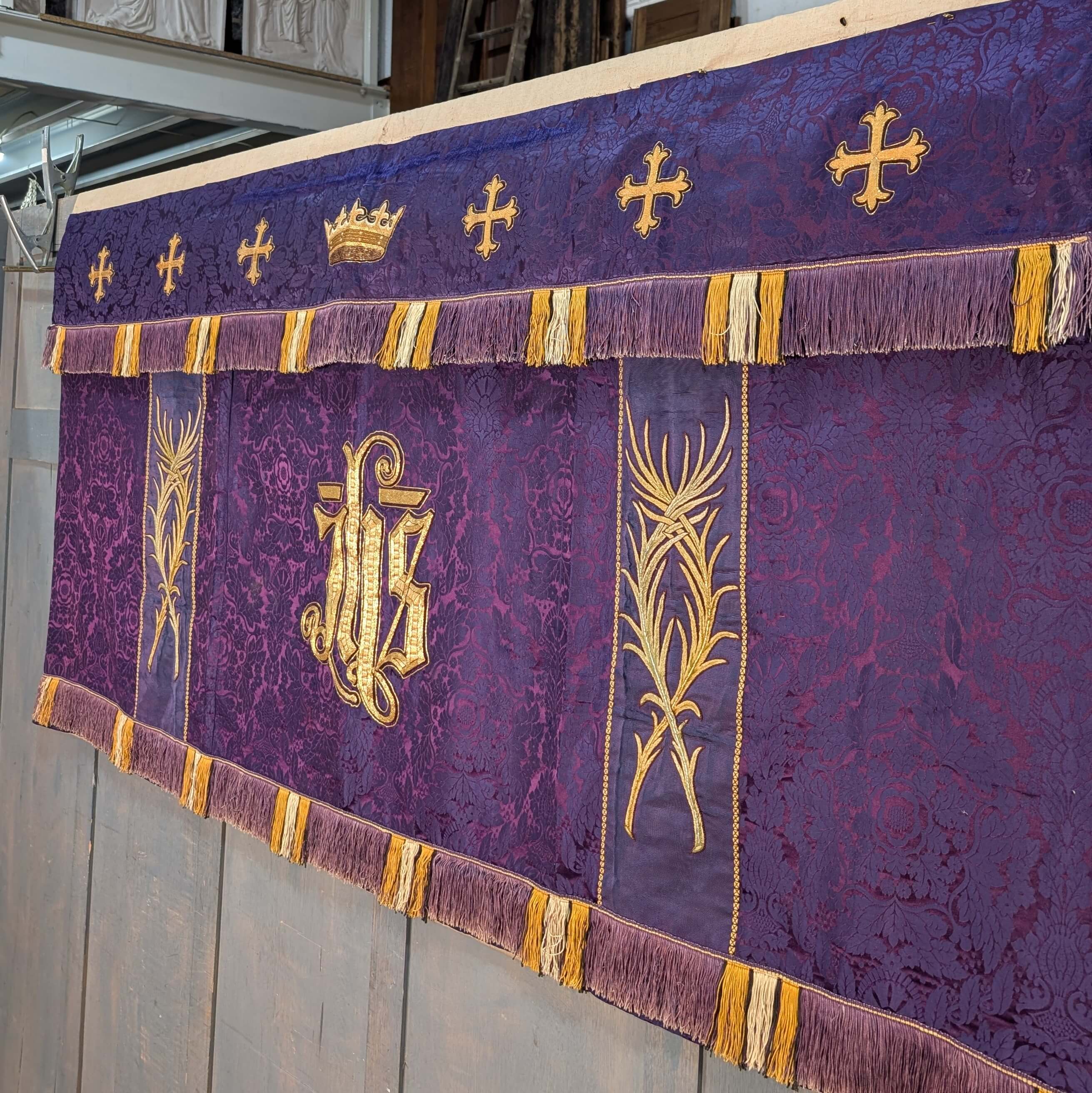 Our product shown on this page Impressive 1920’s Vintage Embroidered Purple and Gold Altar Frontal is currently available for hire.