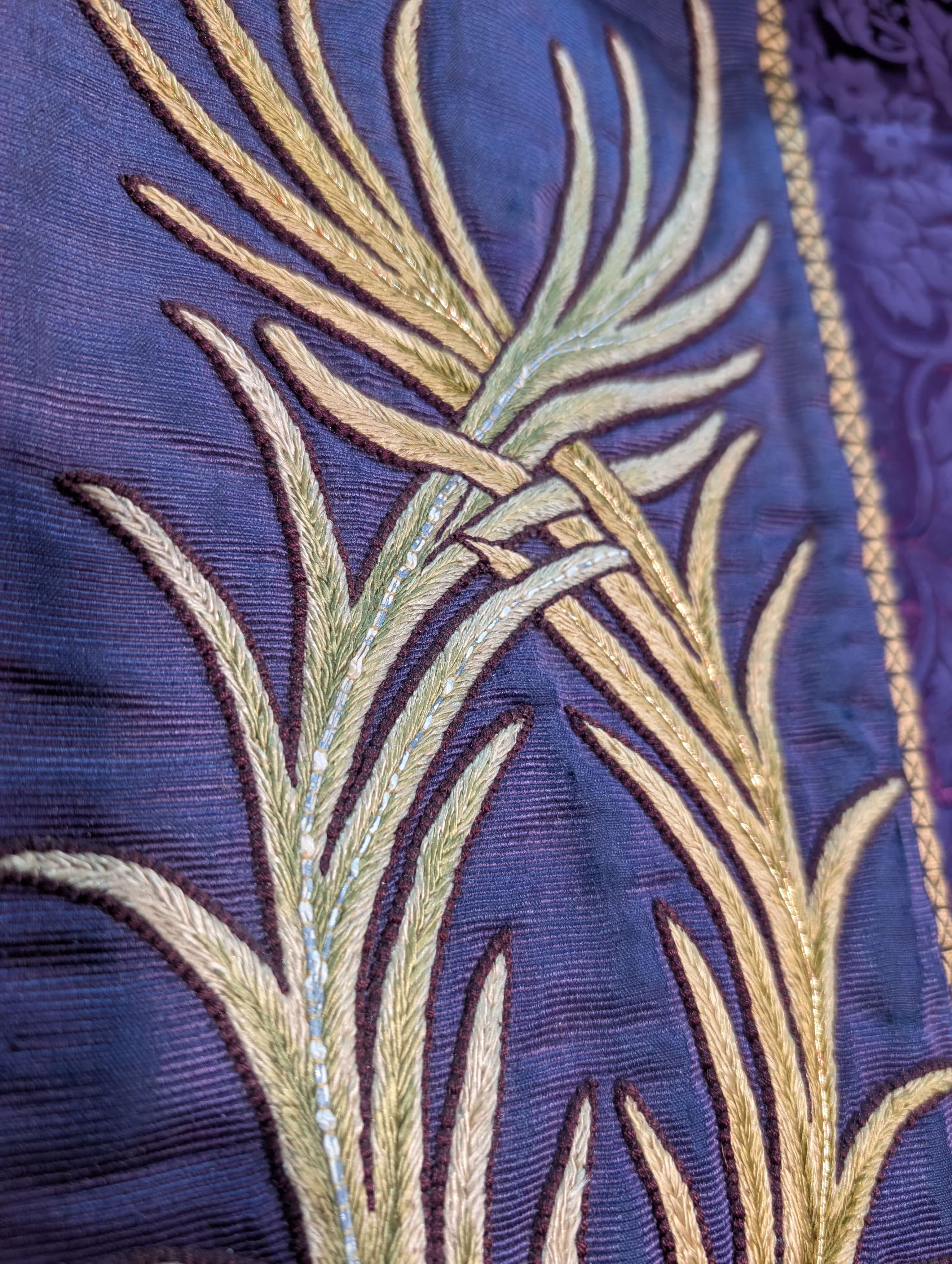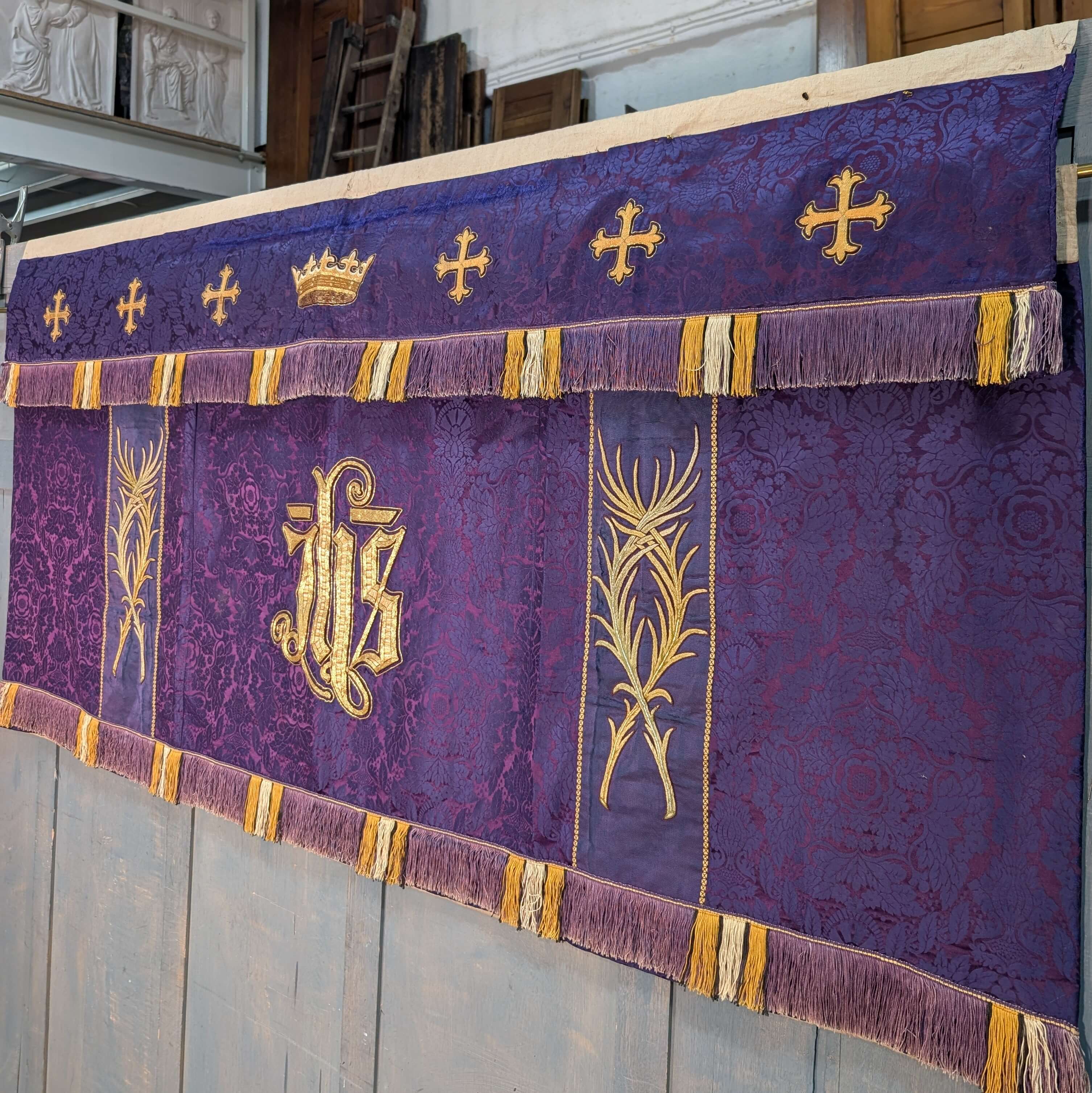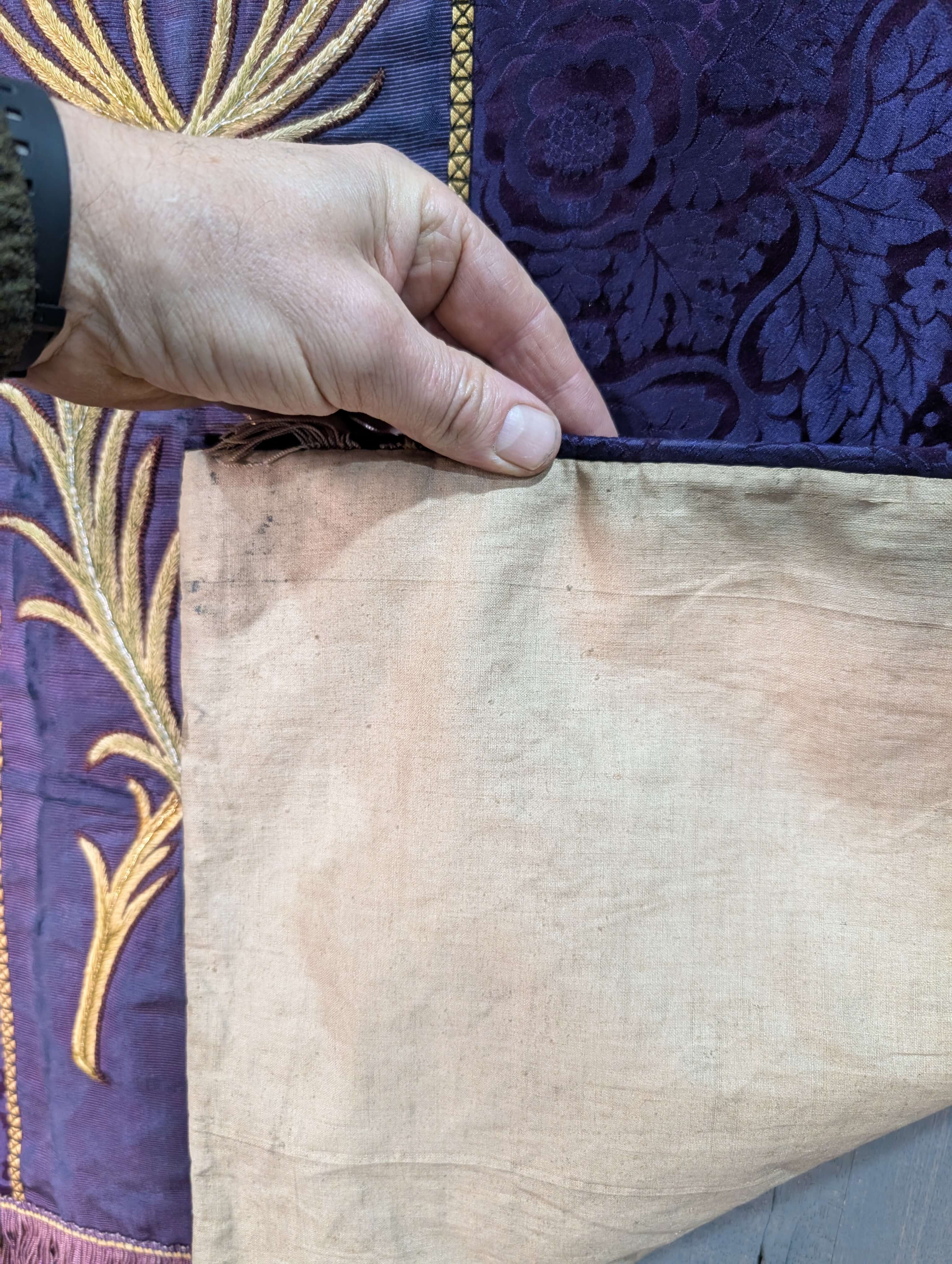 Our product shown on this page Impressive 1920’s Vintage Embroidered Purple and Gold Altar Frontal is currently available for hire.