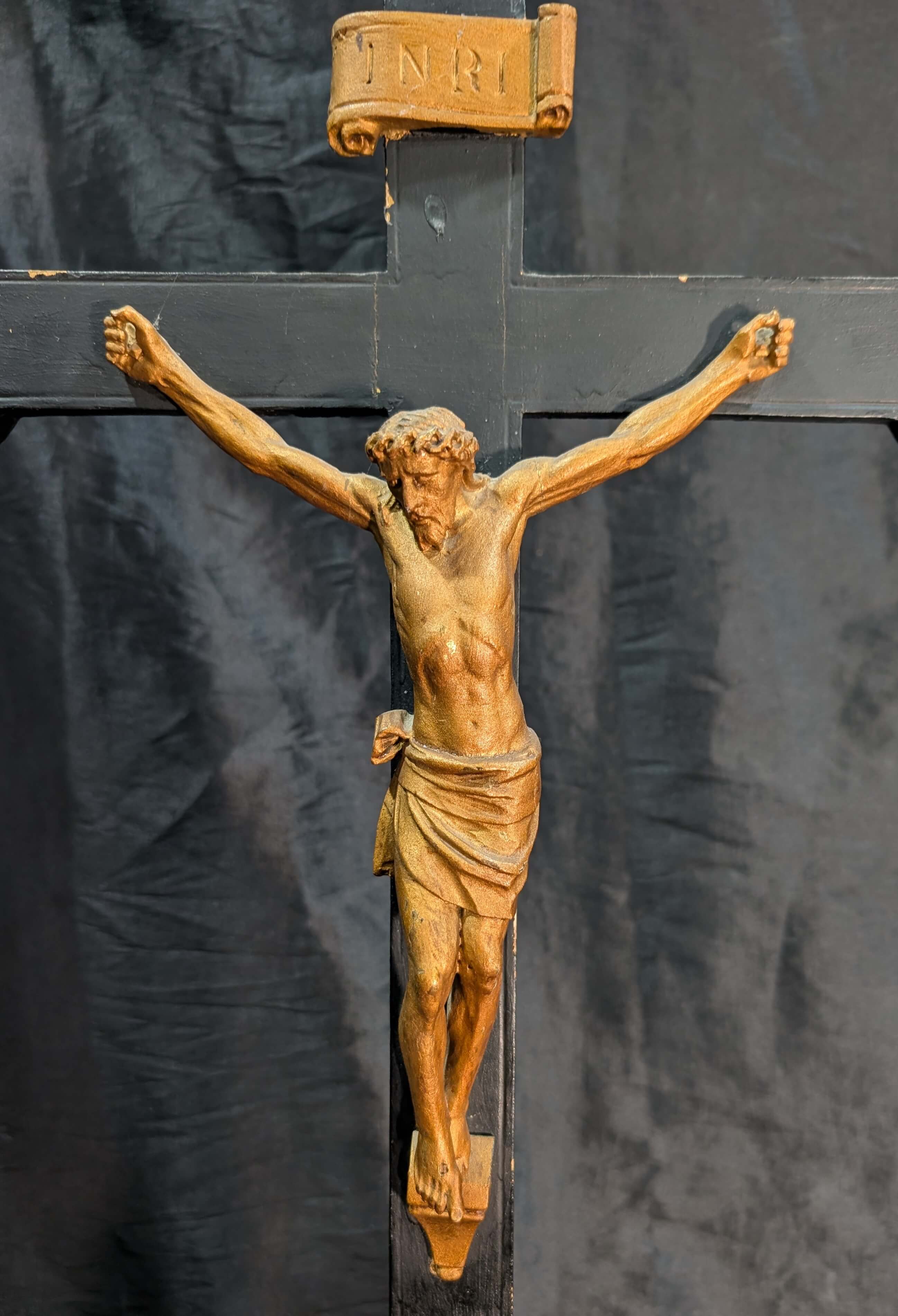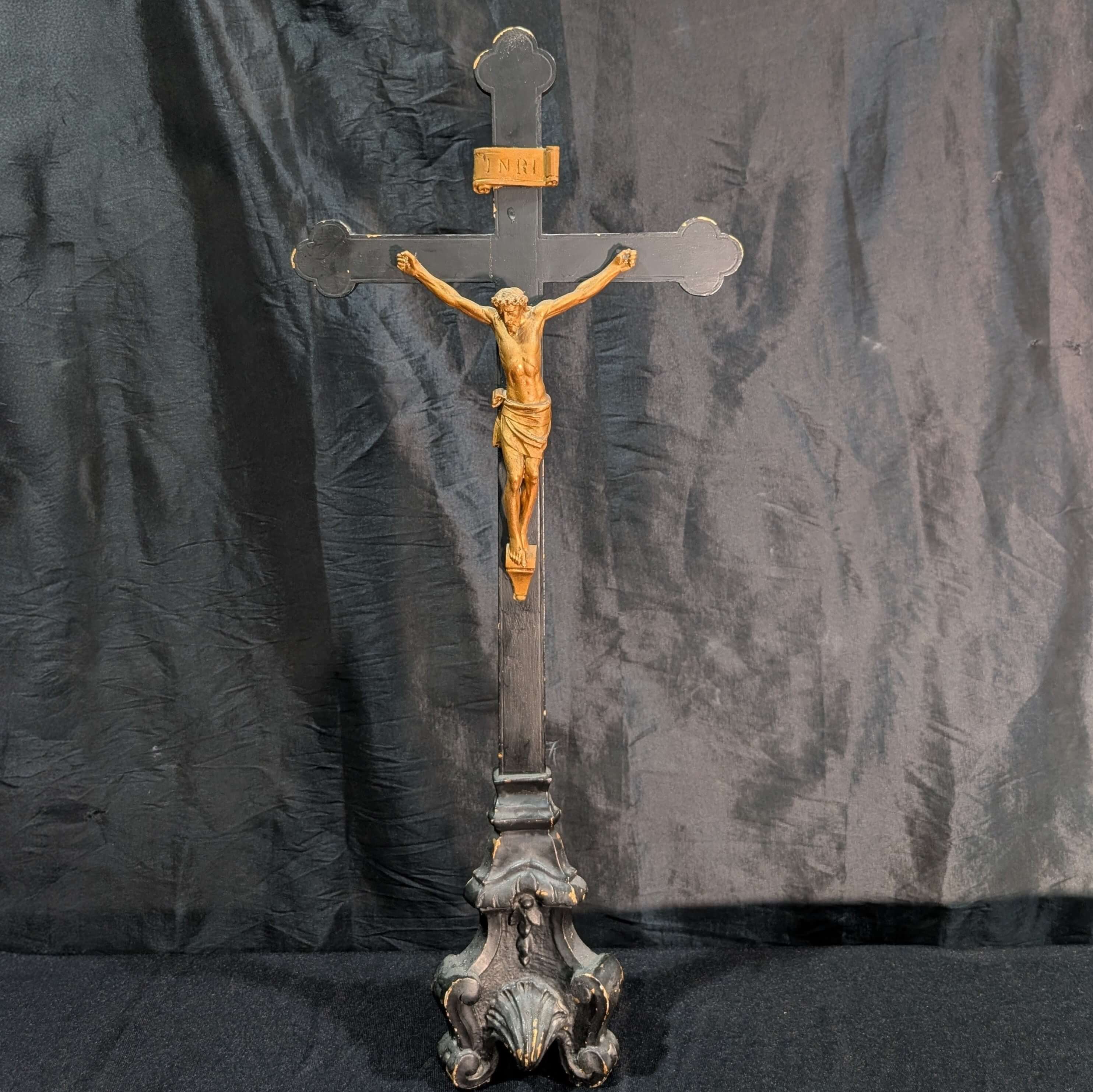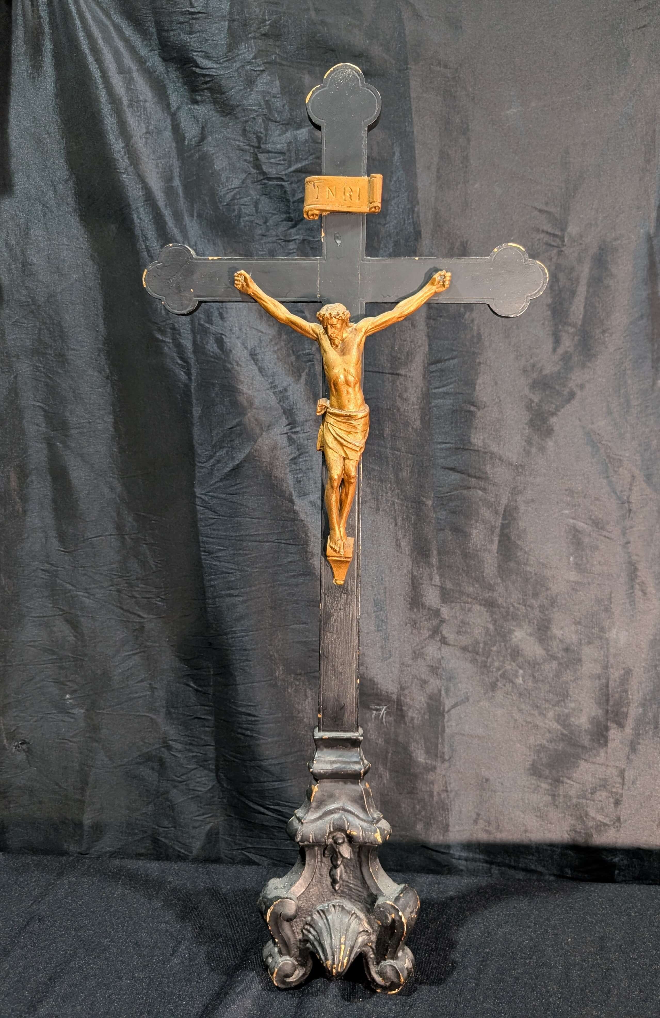 Our product shown on this page Large Carved 1840’s French Altar Crucifix In Gold and Black – Attic Find is currently available for hire.