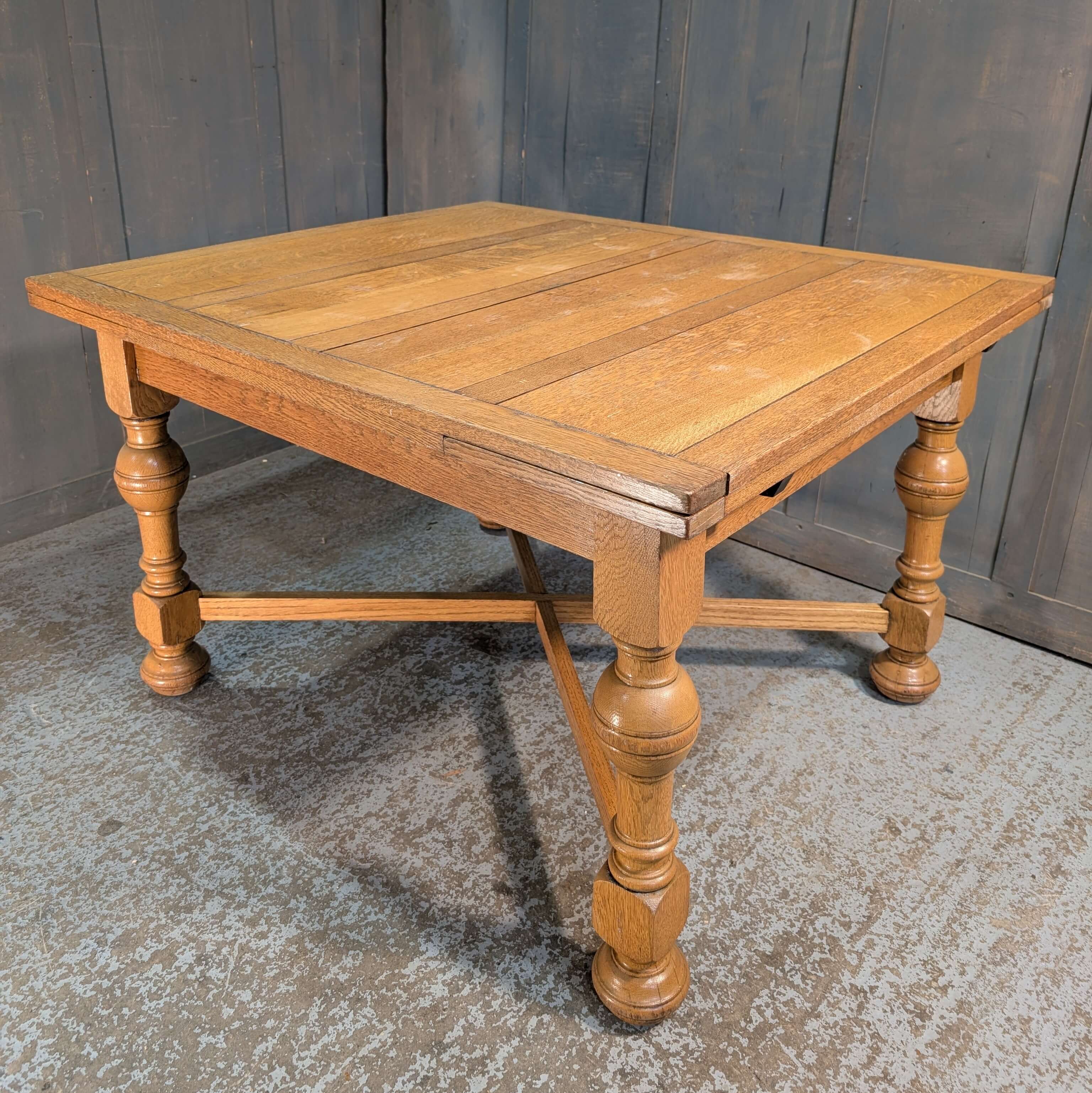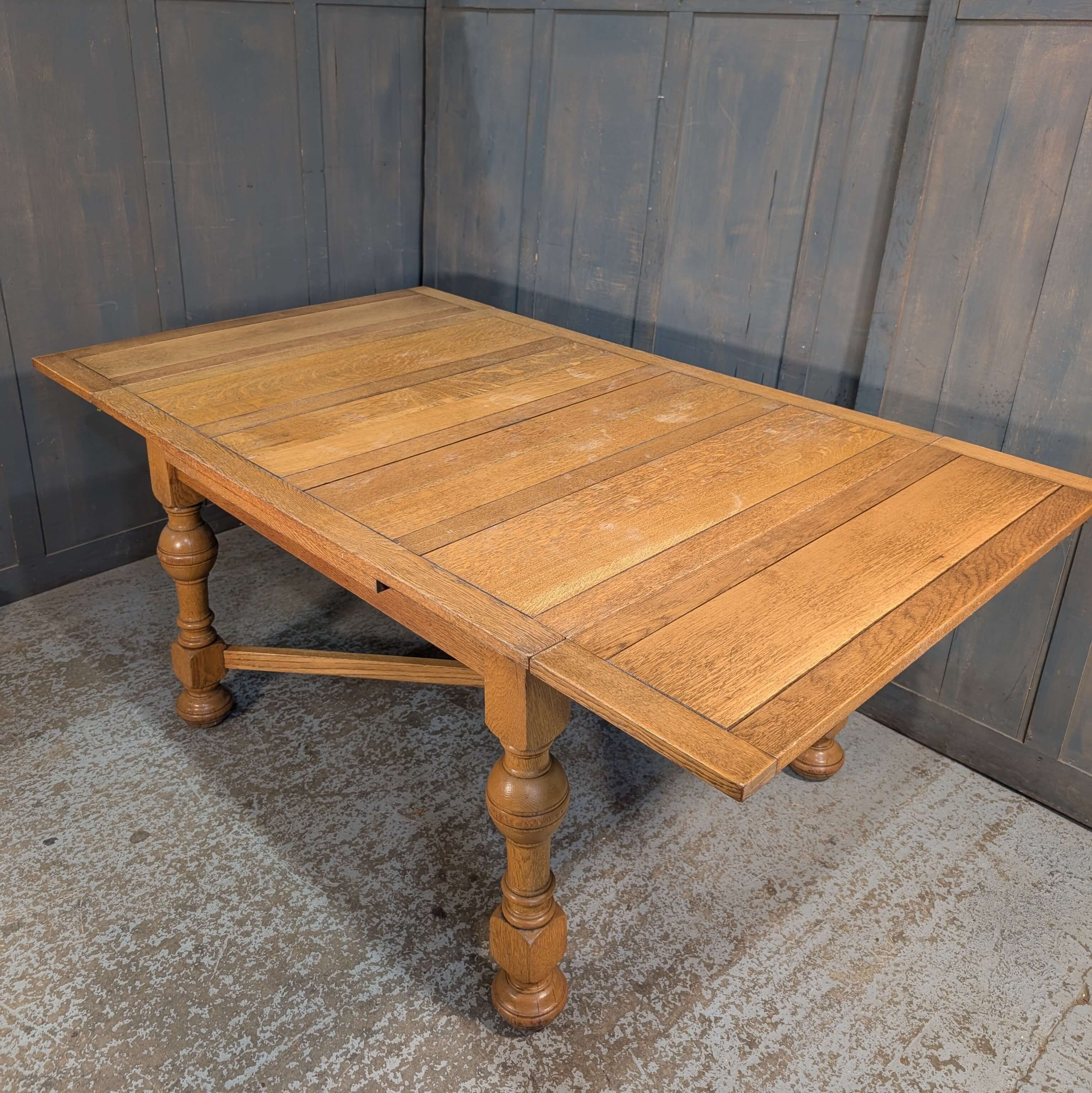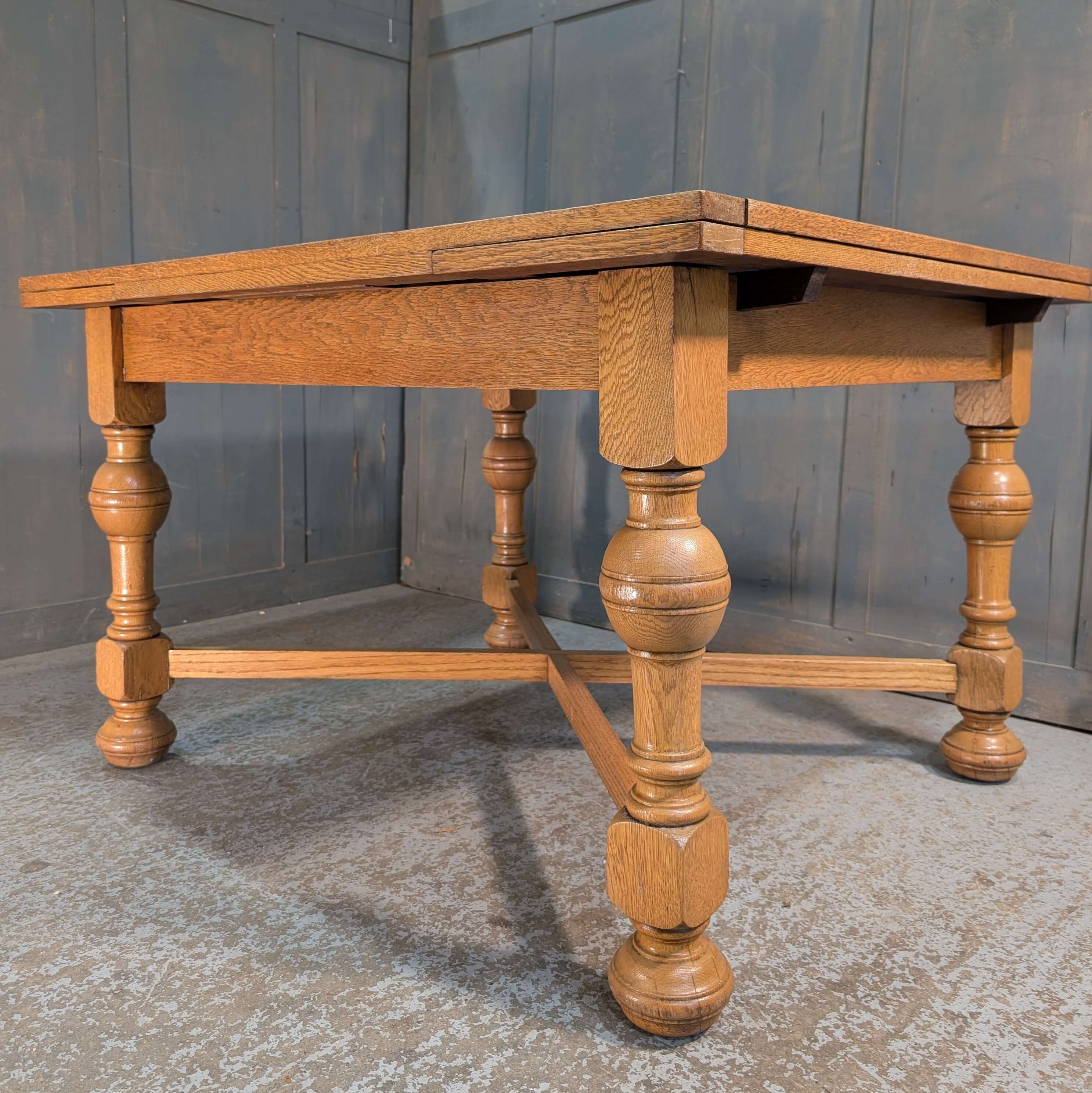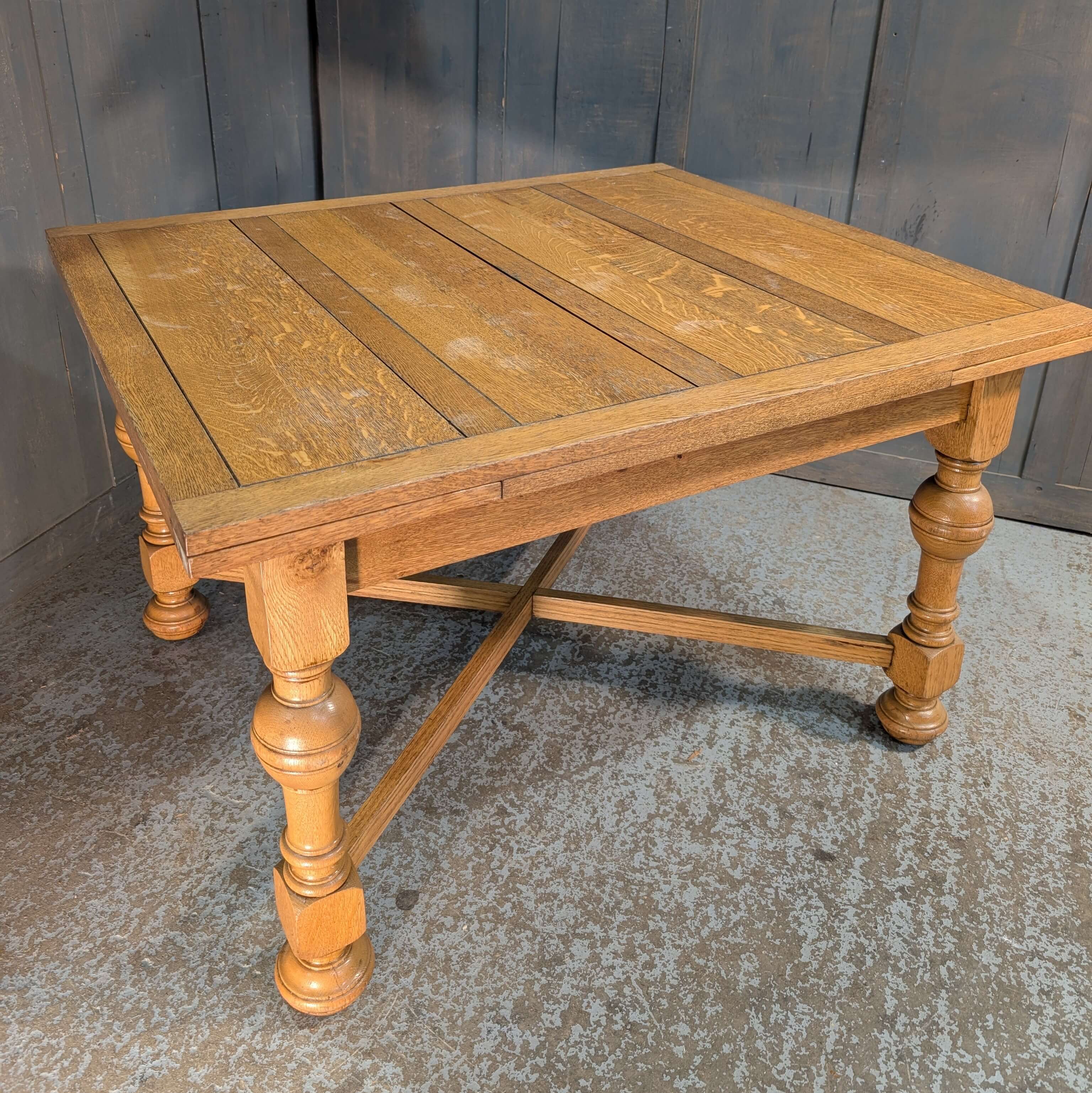 Our product shown on this page Larger than Average 1930’s Vintage Pale Oak X Frame Draw Leaf Table is currently available for hire.