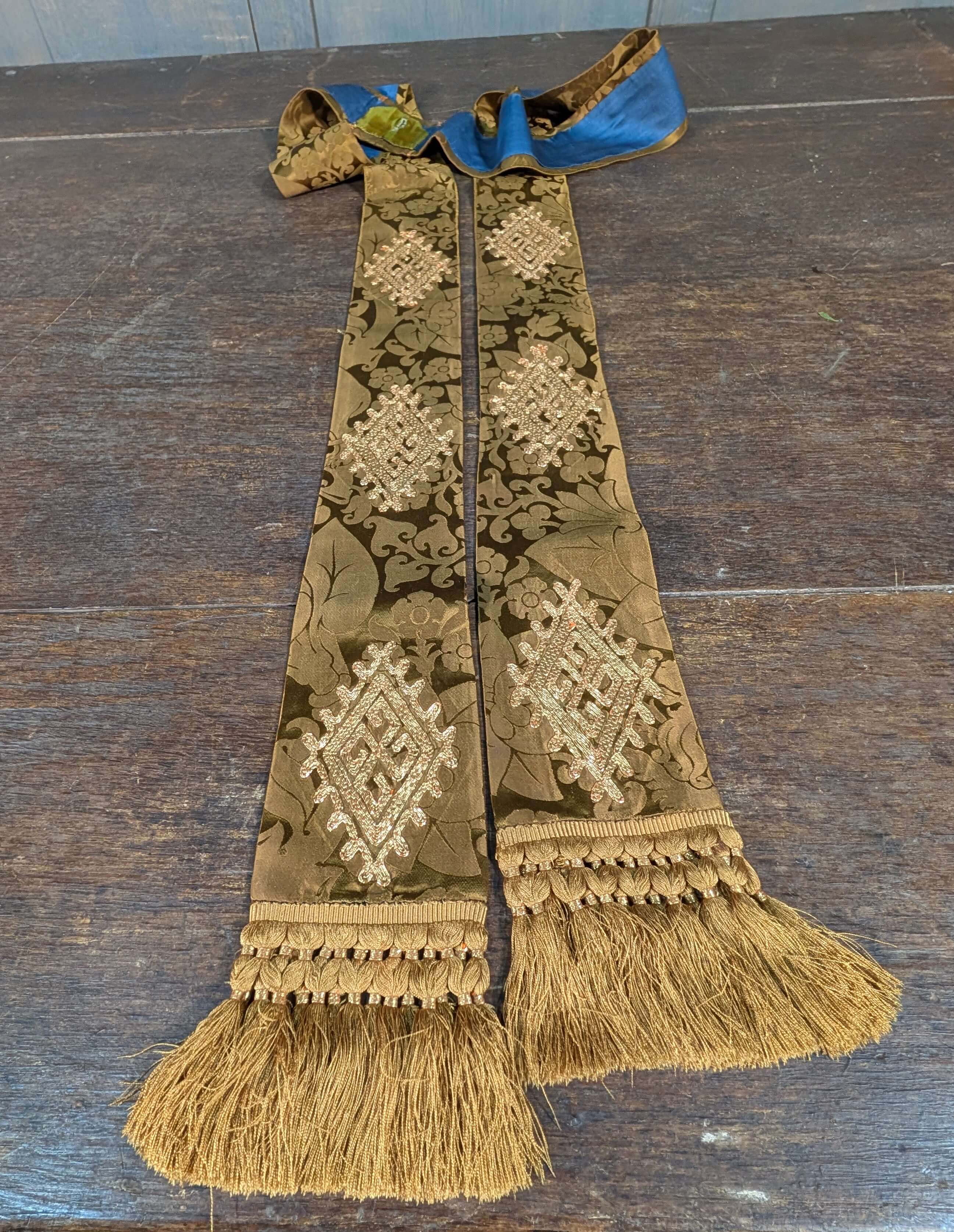 Our product shown on this page Lush Olive Damask Silk Stole with Gold Designs & Fringing is currently available for hire.