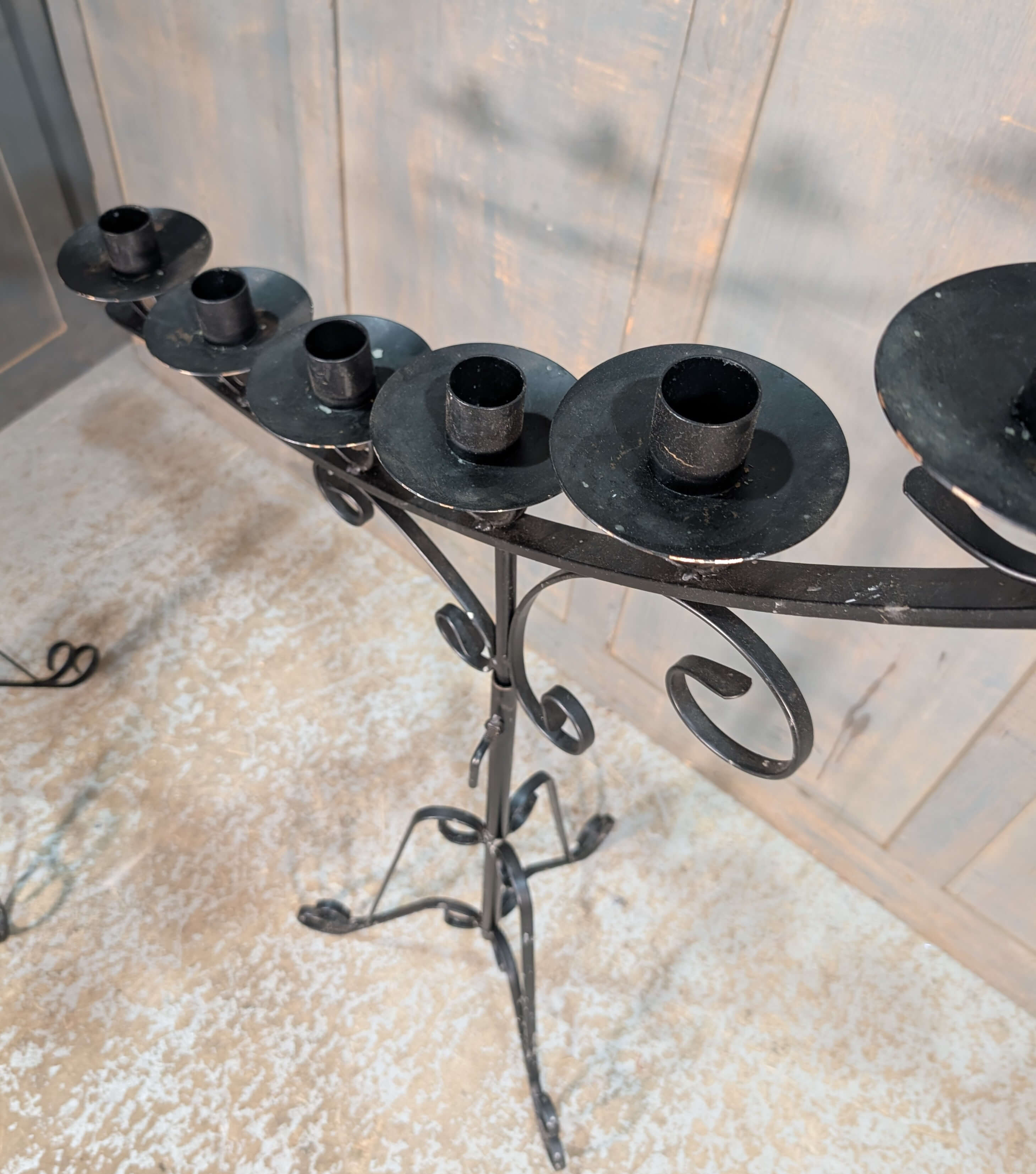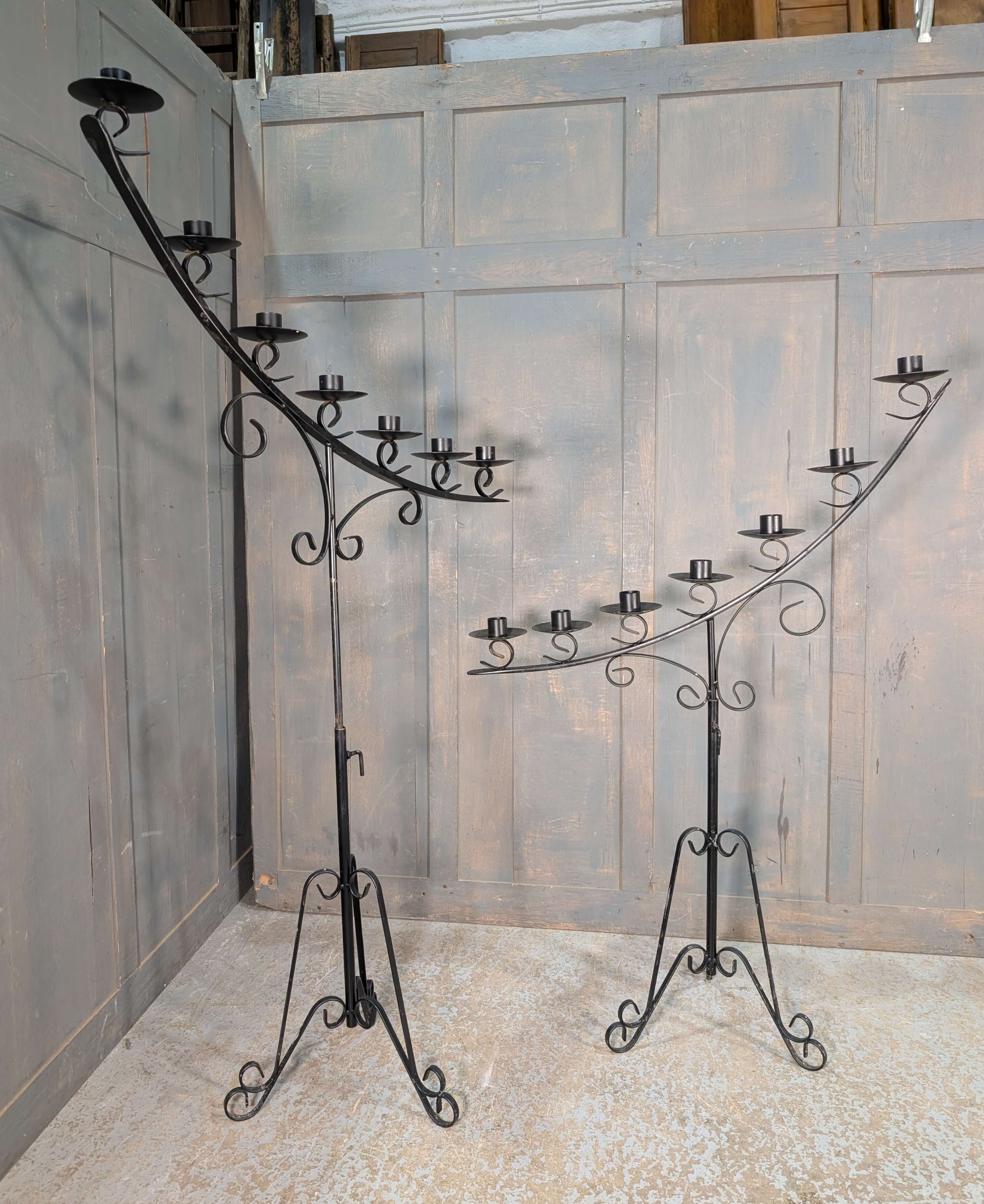 Pair of Black Wrought Steel Large Adjustable Seven Branch Benediction Candelabra (SOLD)