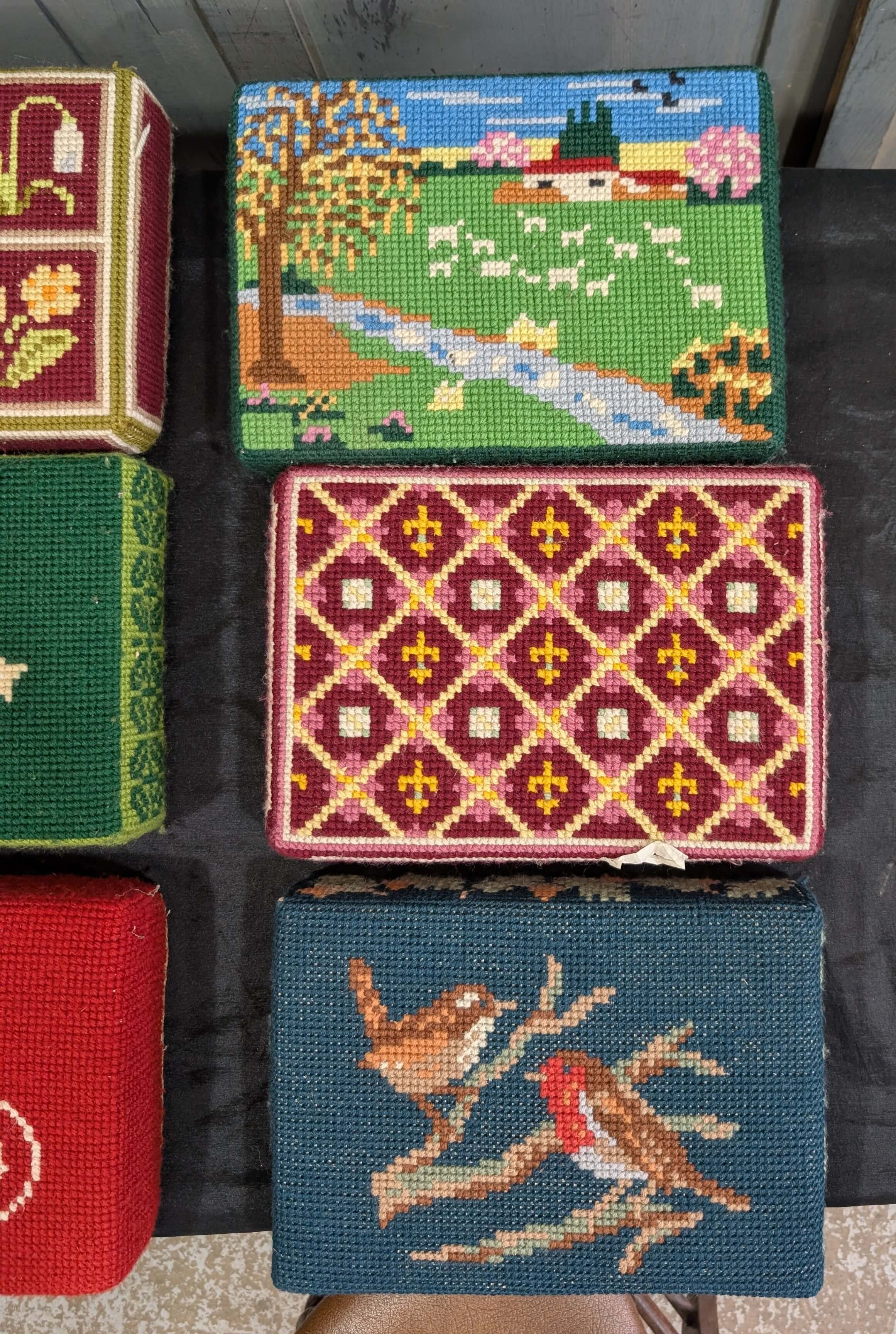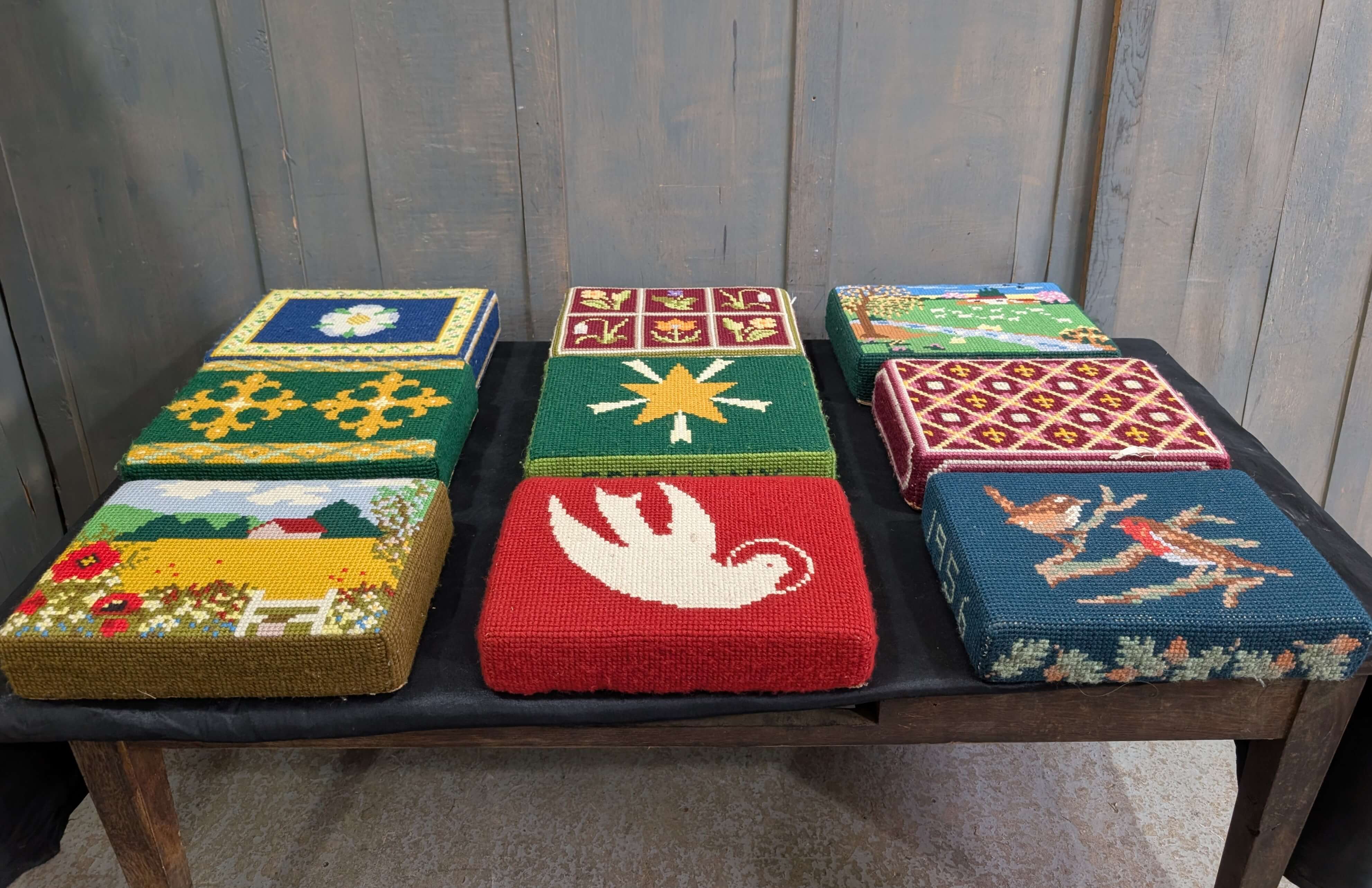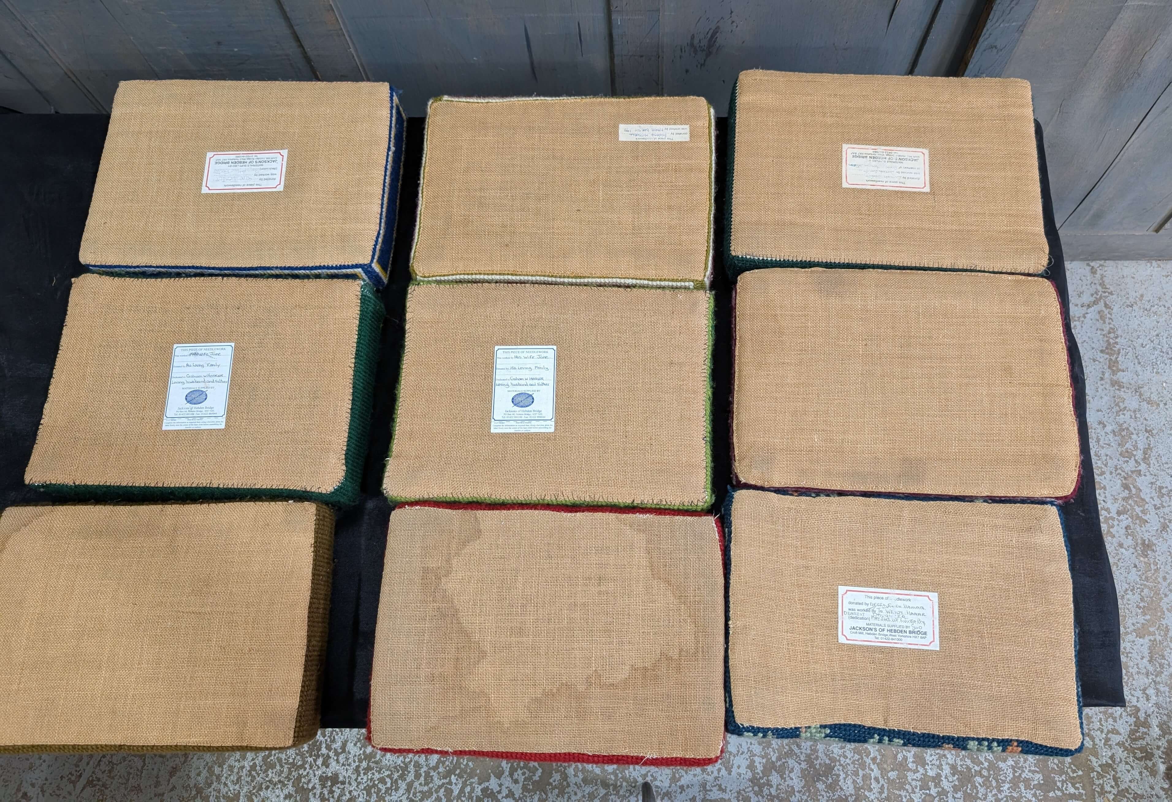 Our product shown on this page Set of Nine Brightly Coloured Hand Embroidered Kneelers Hassocks Cushions #2 is currently available for hire.