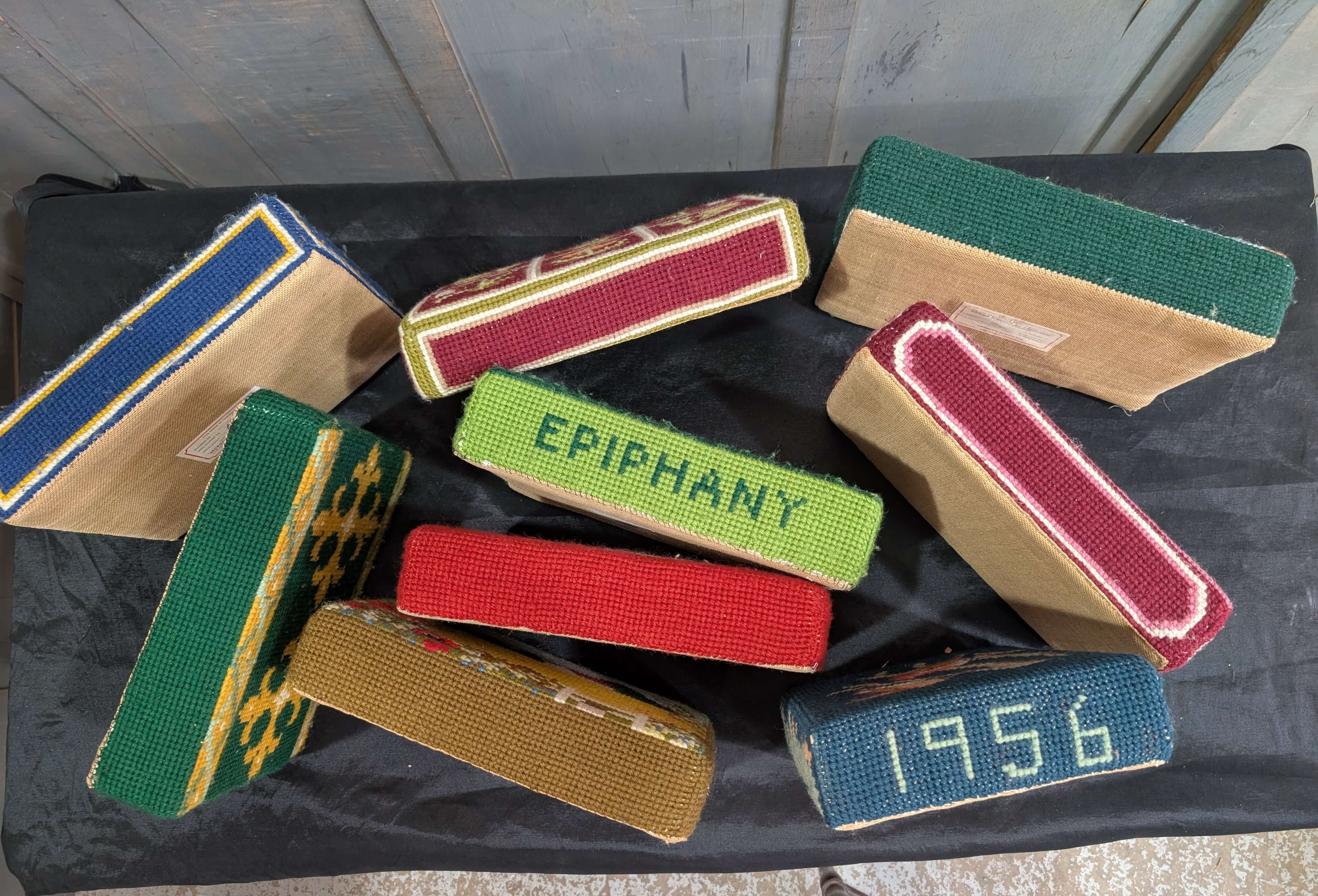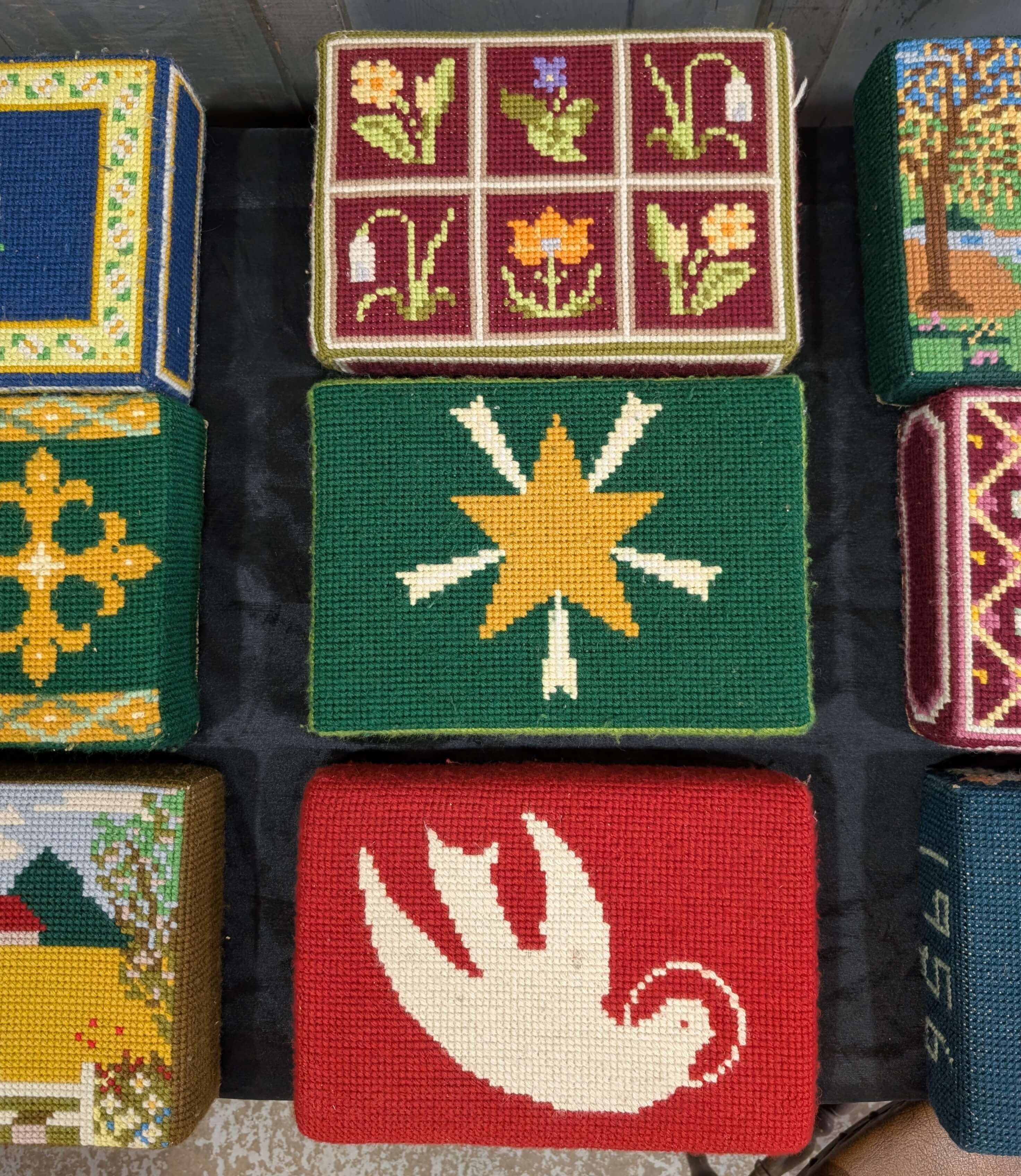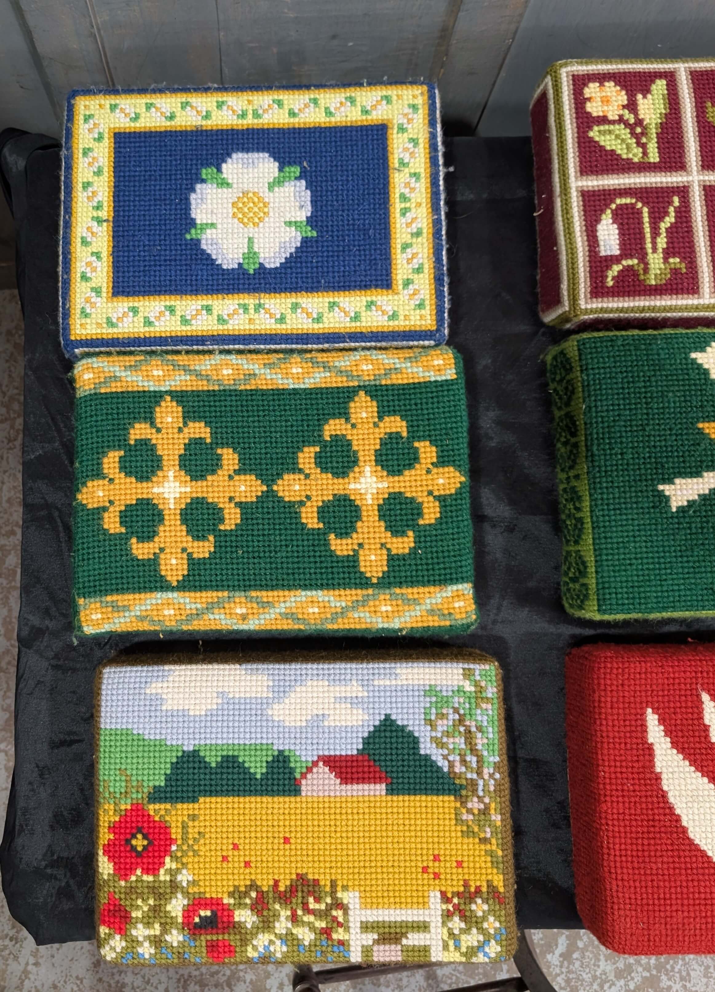 Our product shown on this page Set of Nine Brightly Coloured Hand Embroidered Kneelers Hassocks Cushions #2 is currently available for hire.