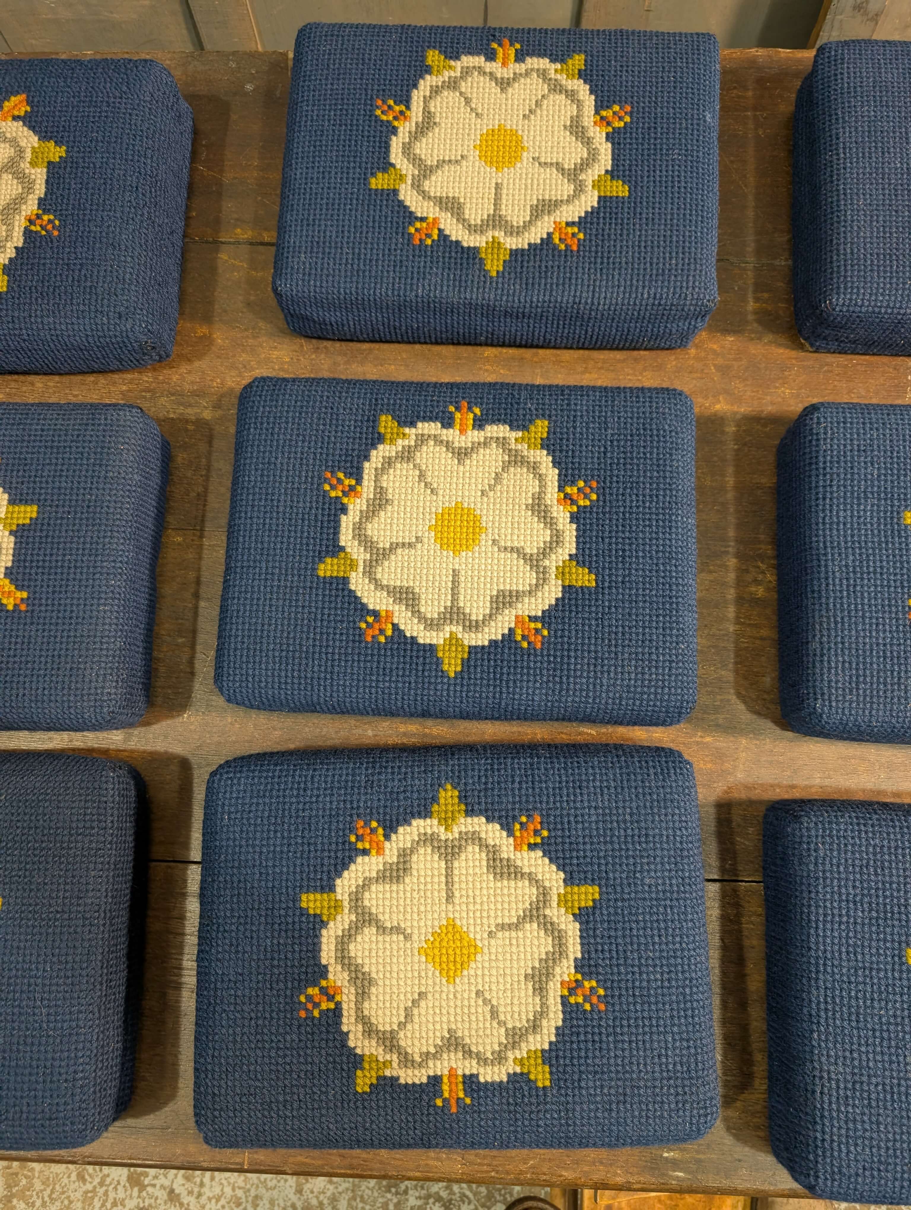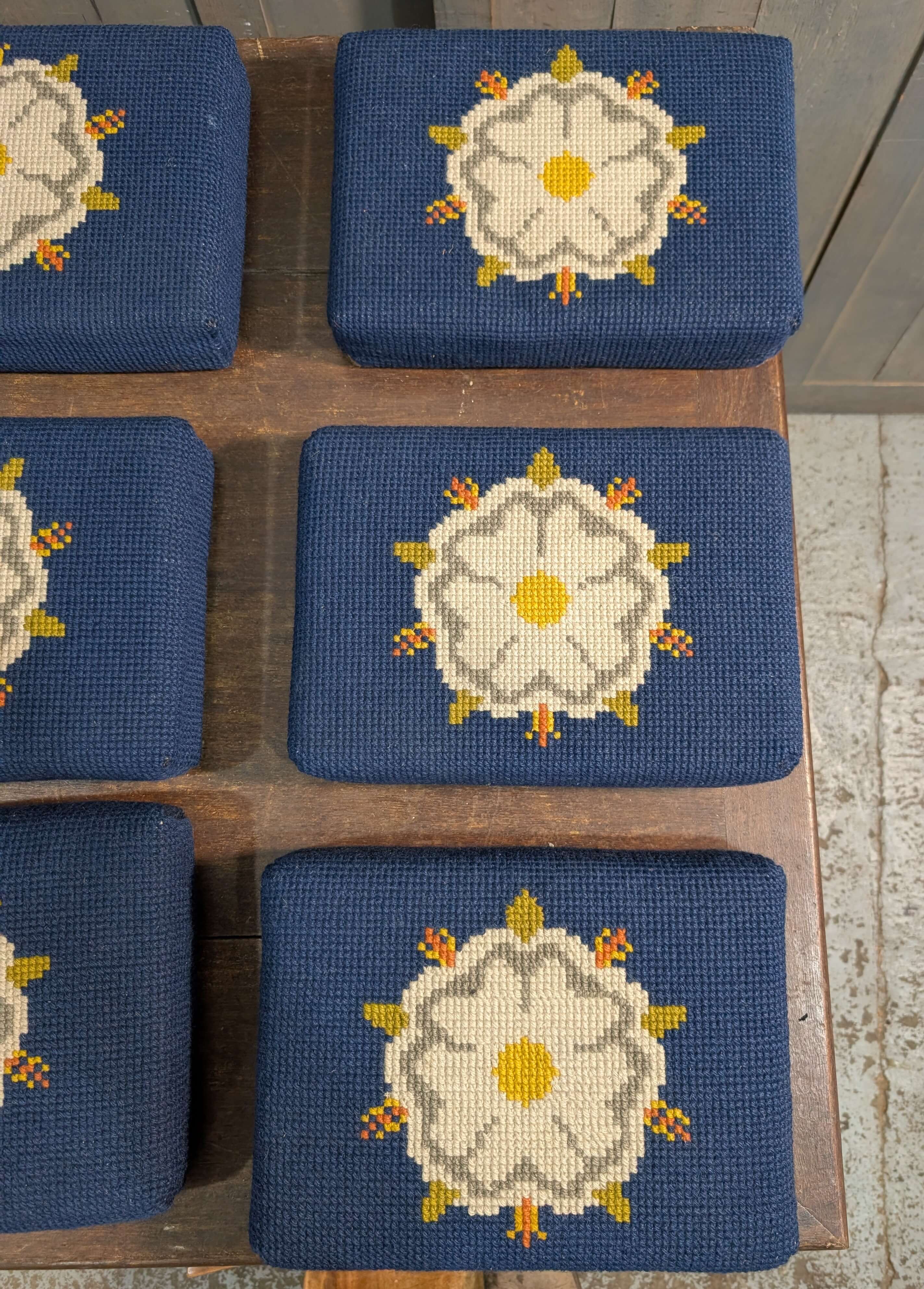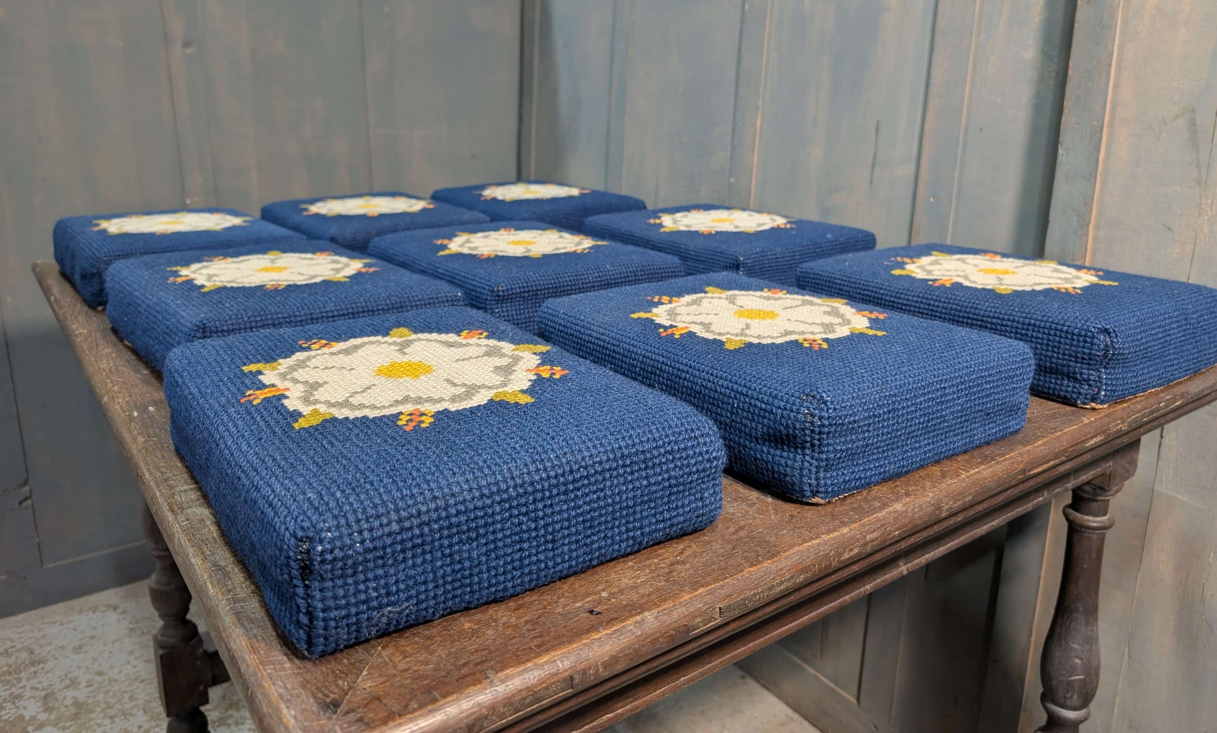 Our product shown on this page Set of Nine Hand Made Church Kneelers Hassocks Cushions with White English Rose on Blue Background is currently available for hire.