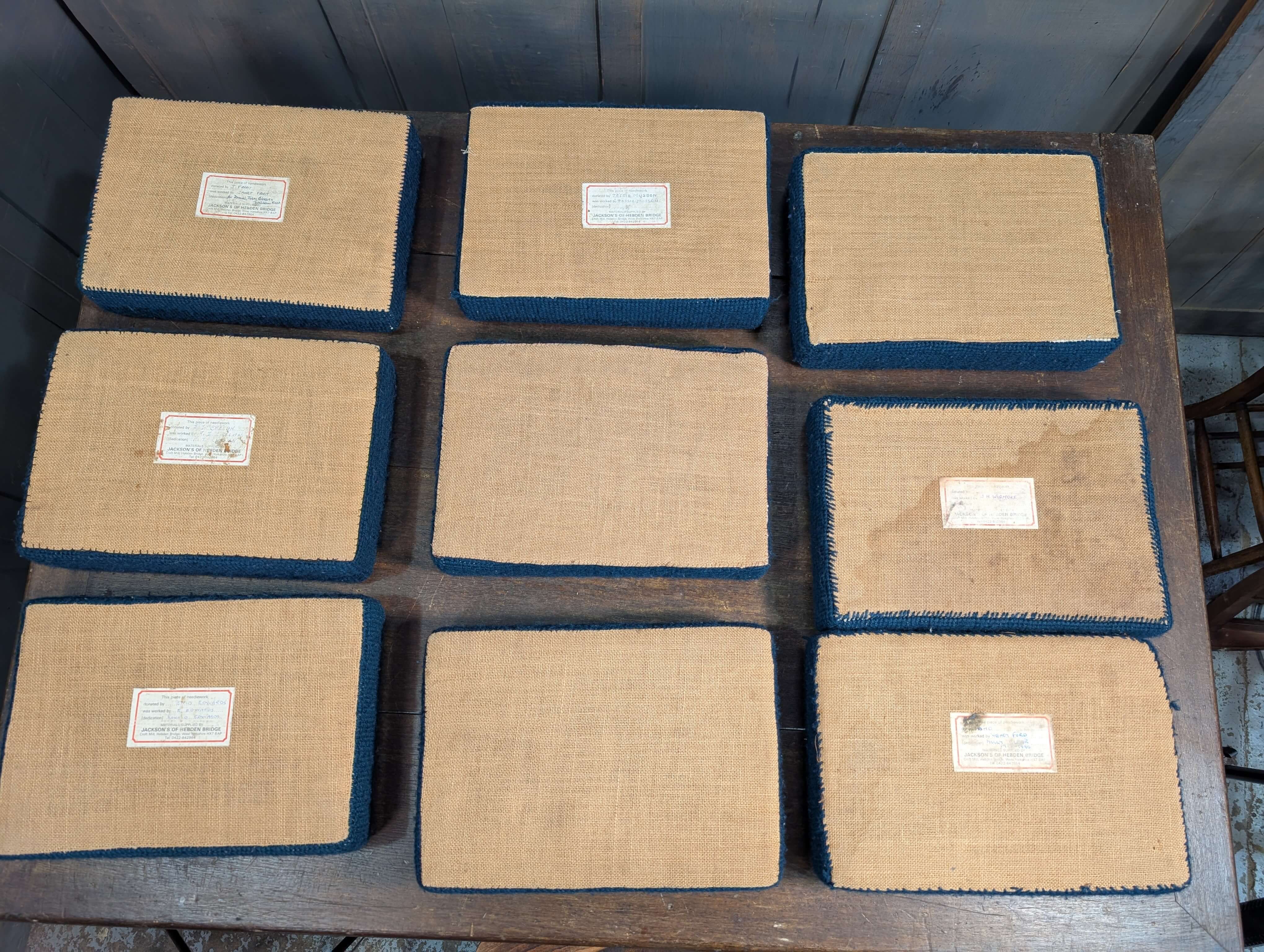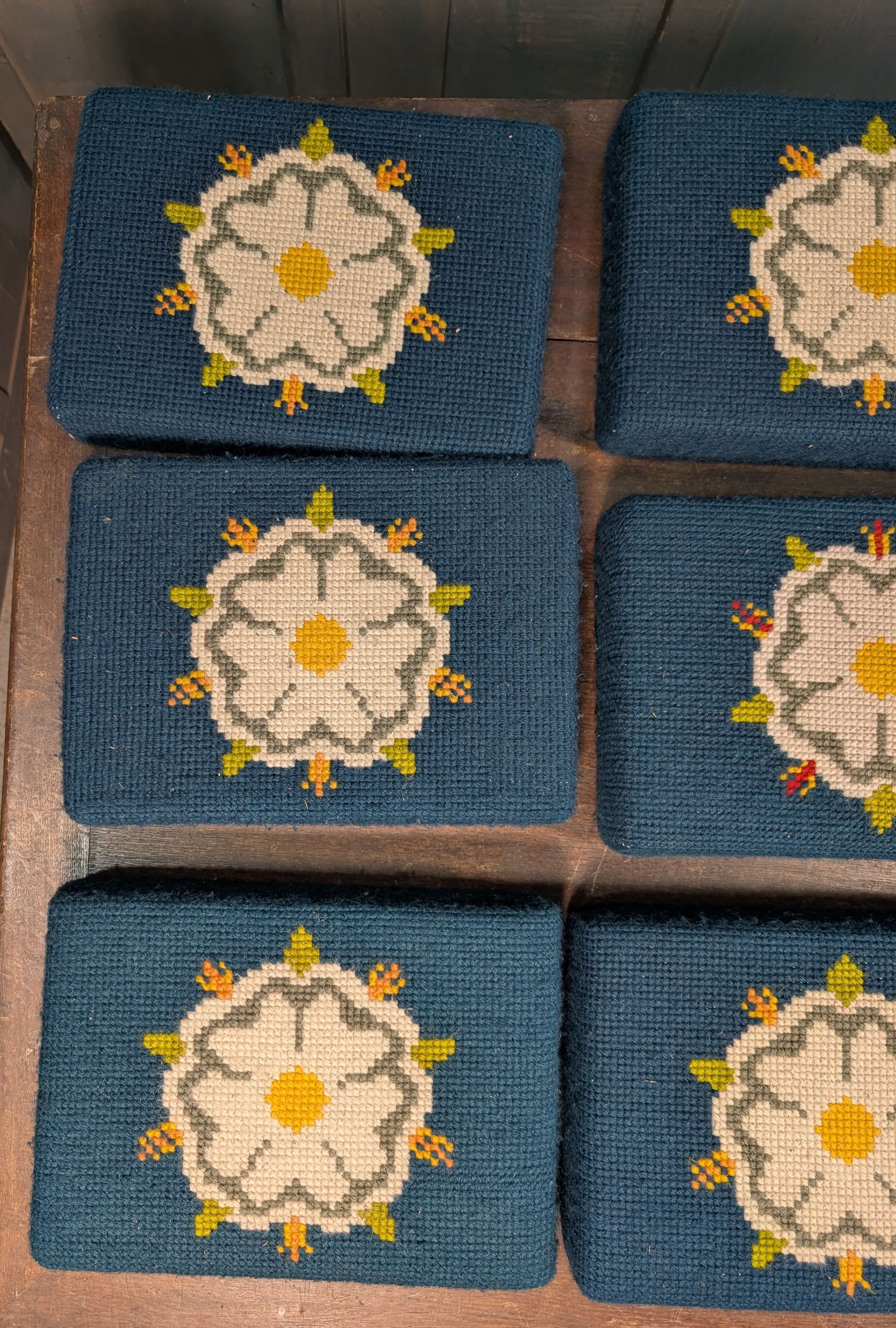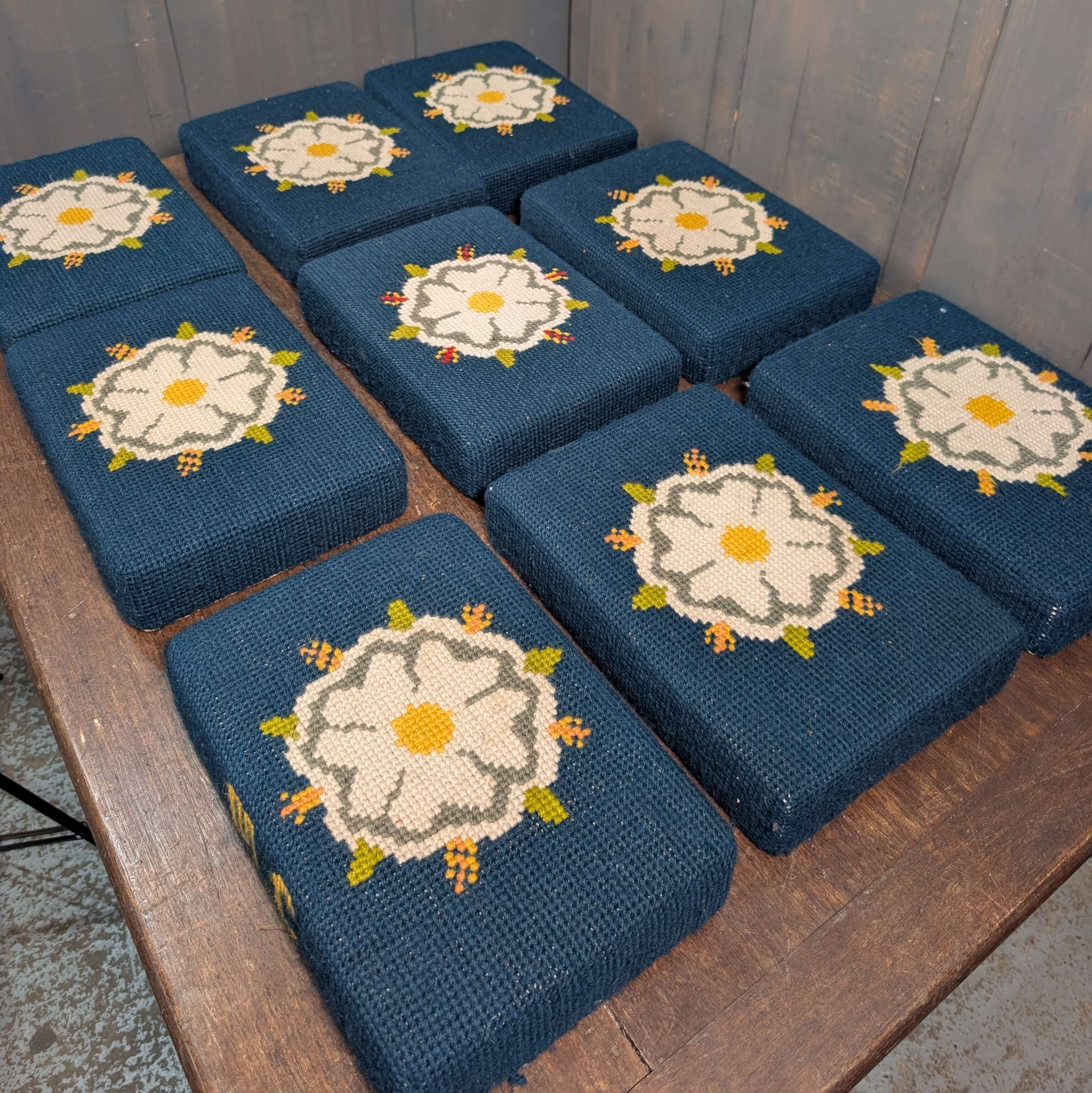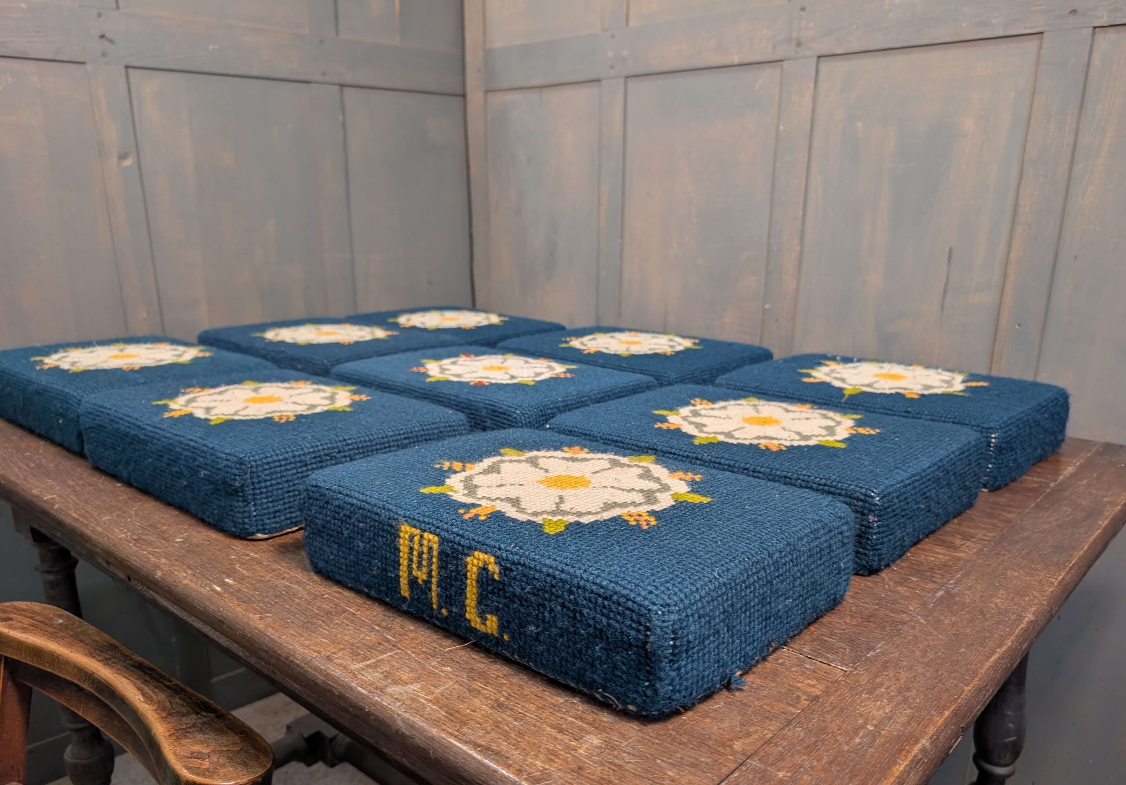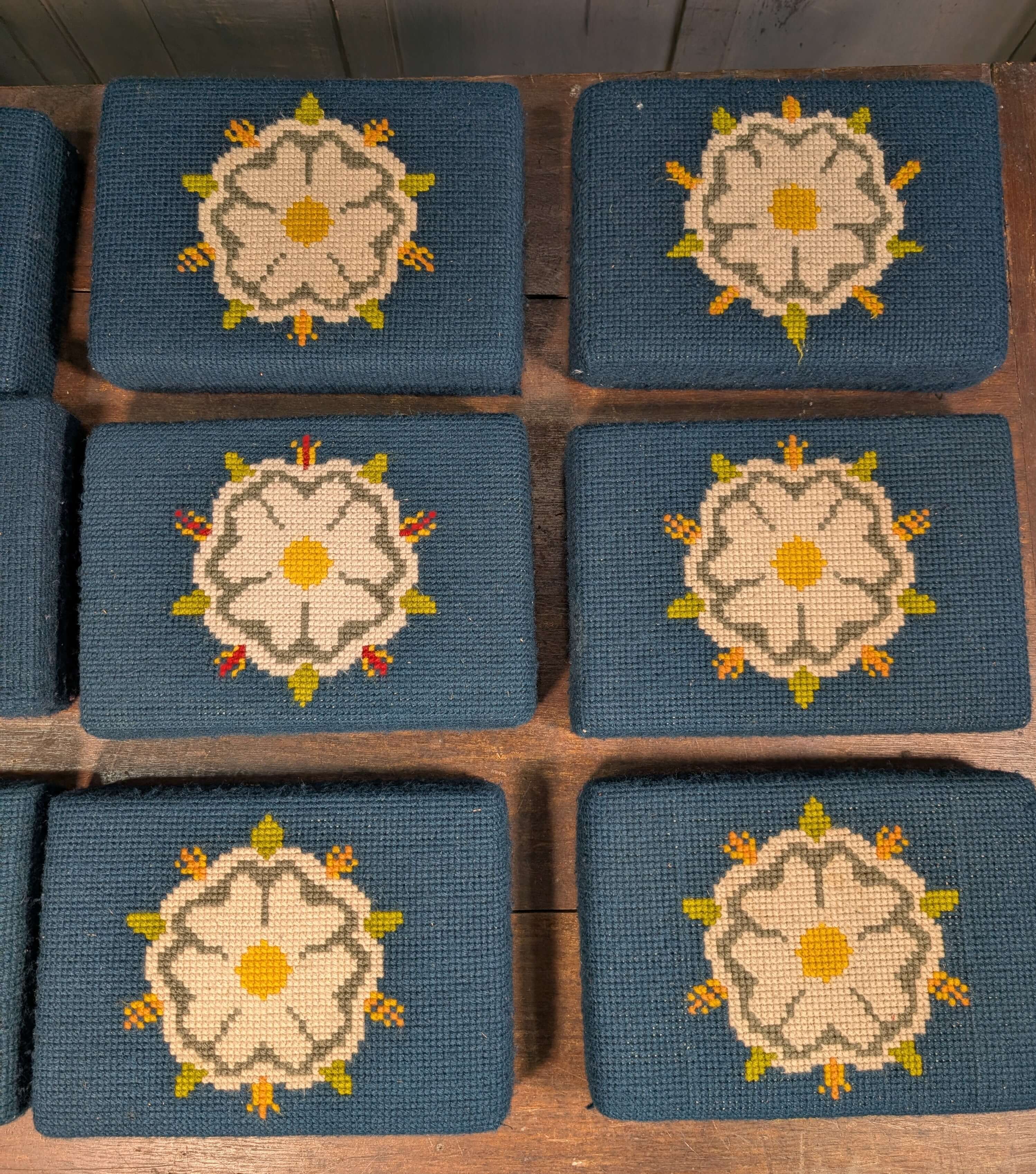 Our product shown on this page Set of Nine Hand Made Church Kneelers Hassocks Cushions with White English Rose on Teal Background is currently available for hire.