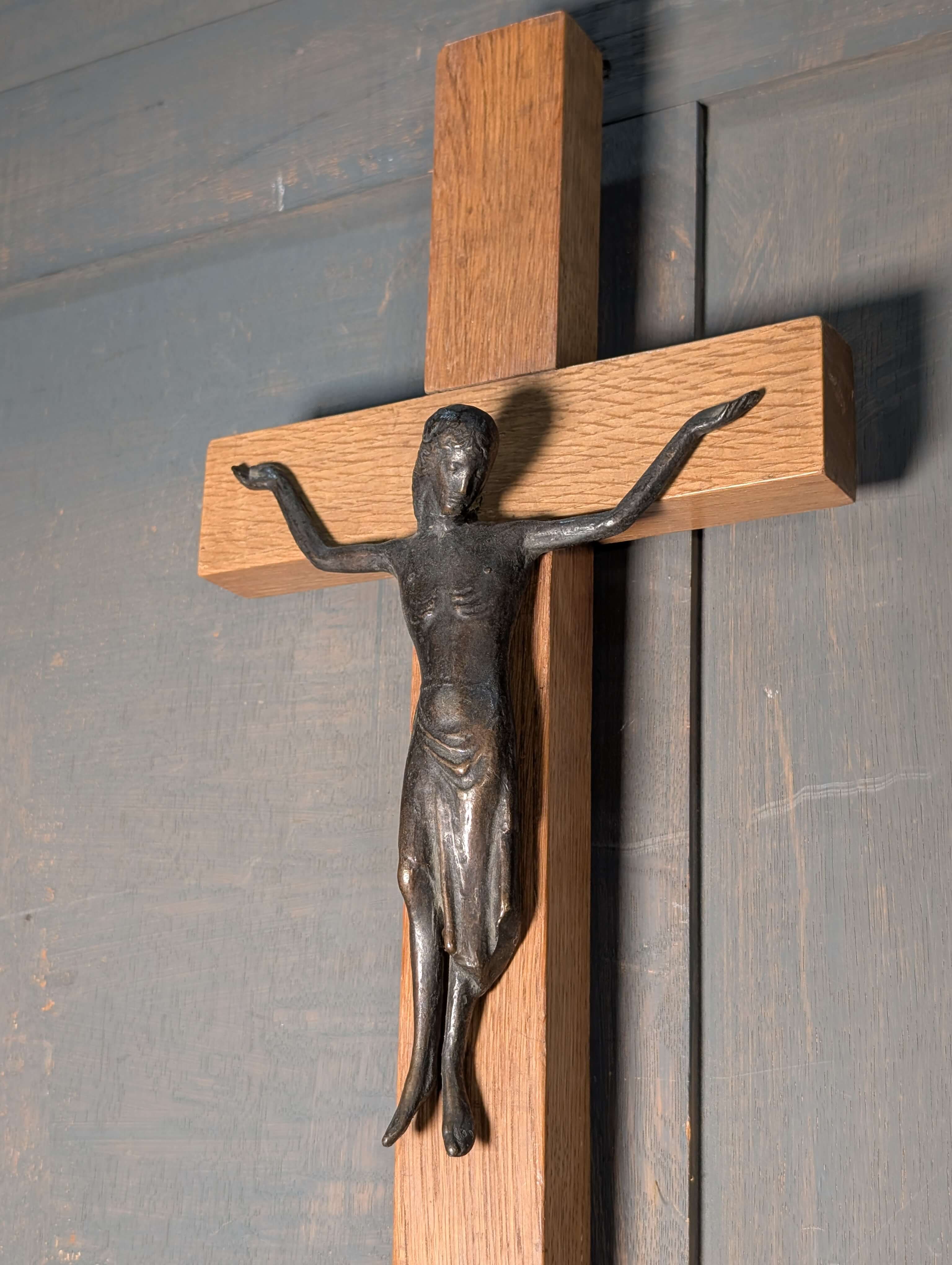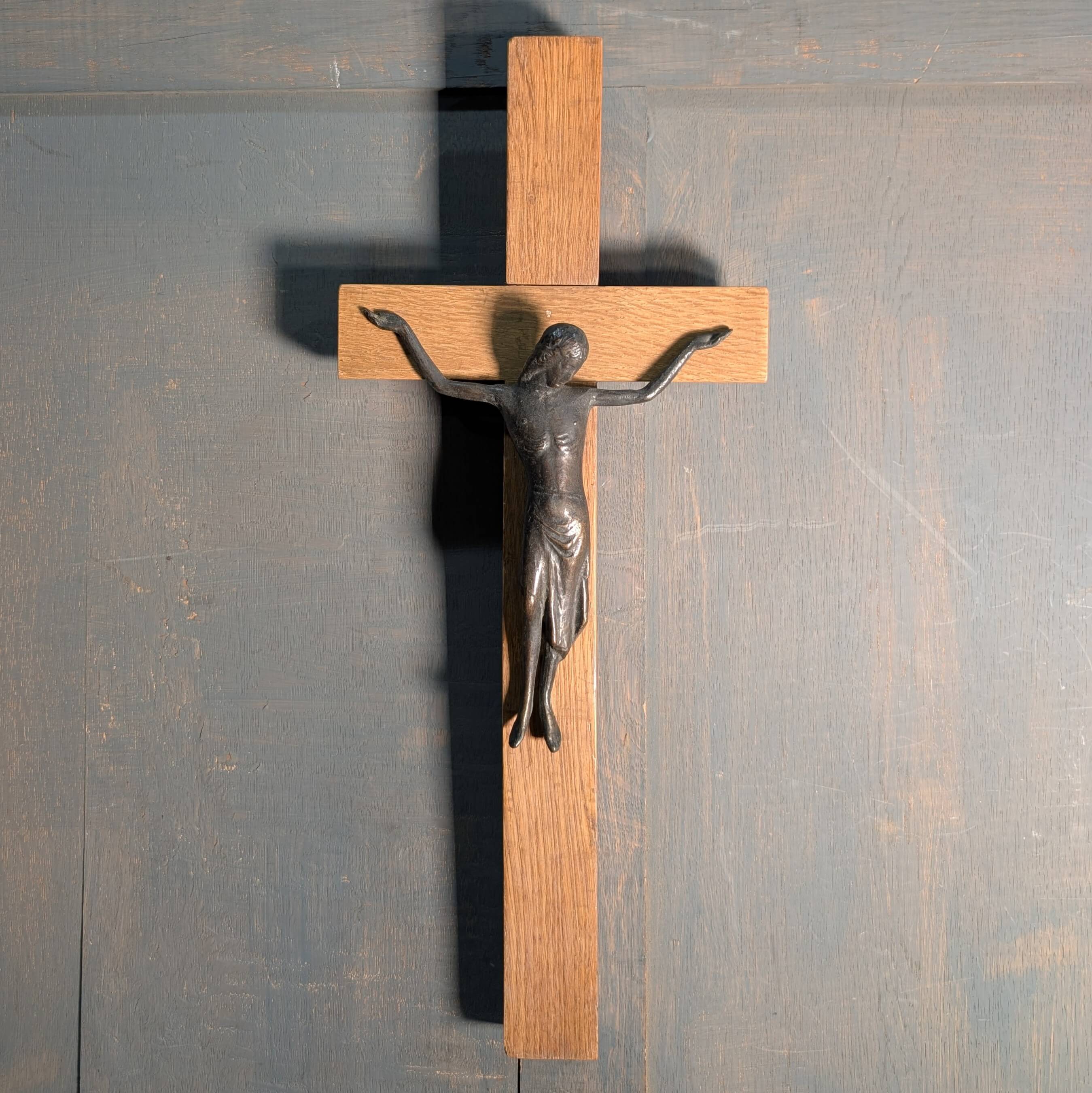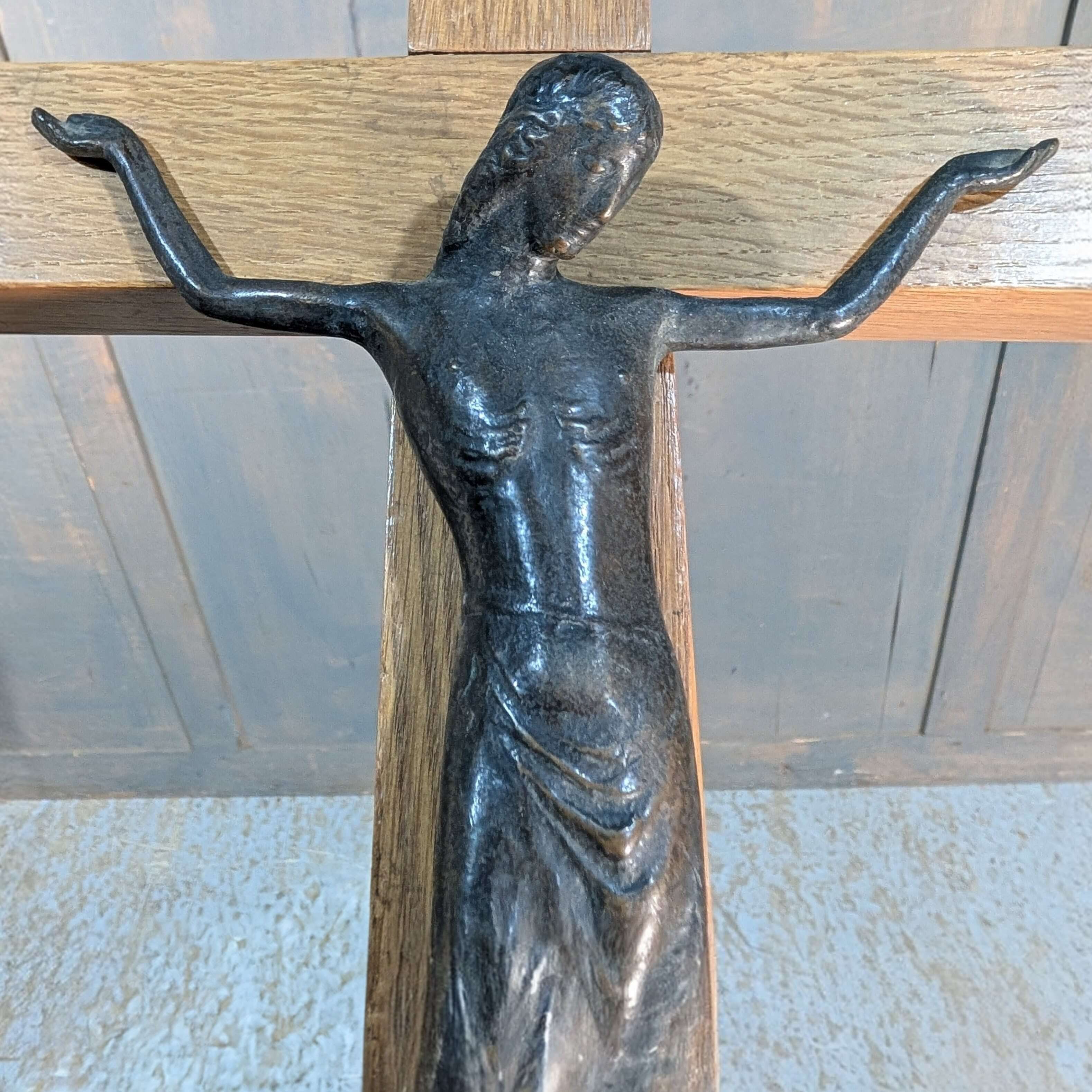 Striking Modernist Bronze & Oak Crucifix Circa 1965