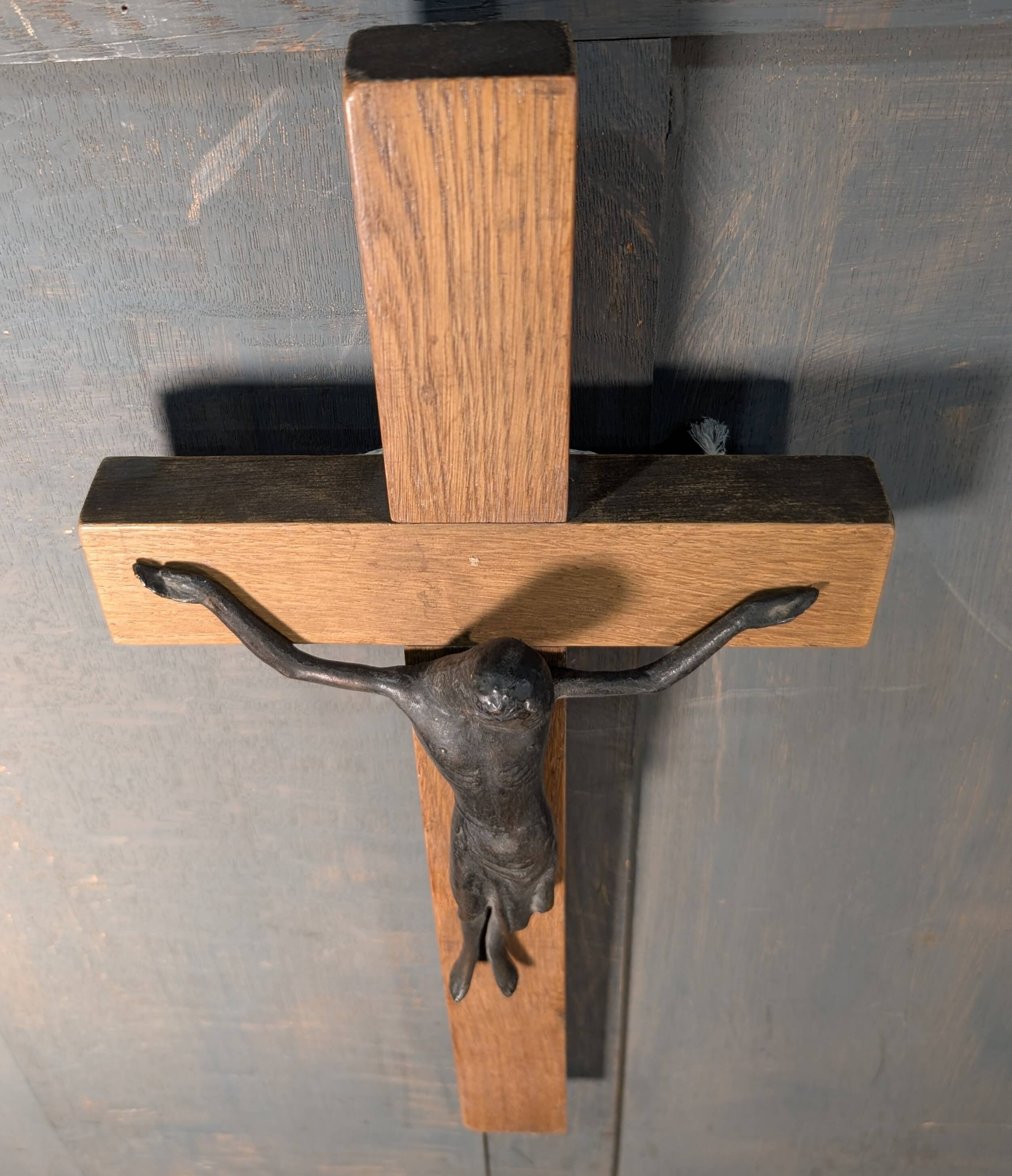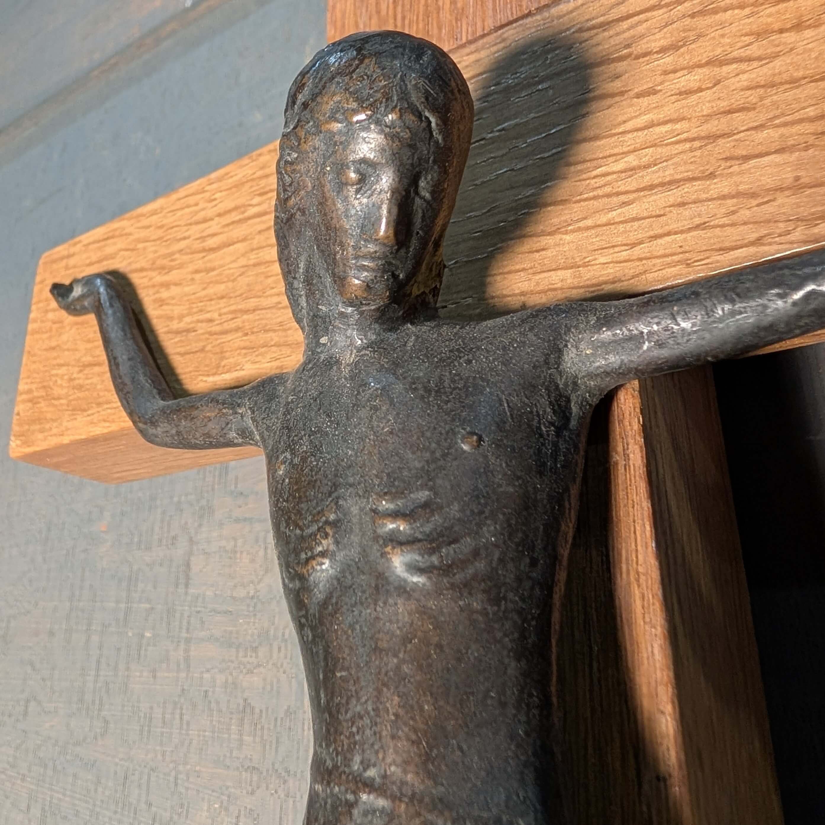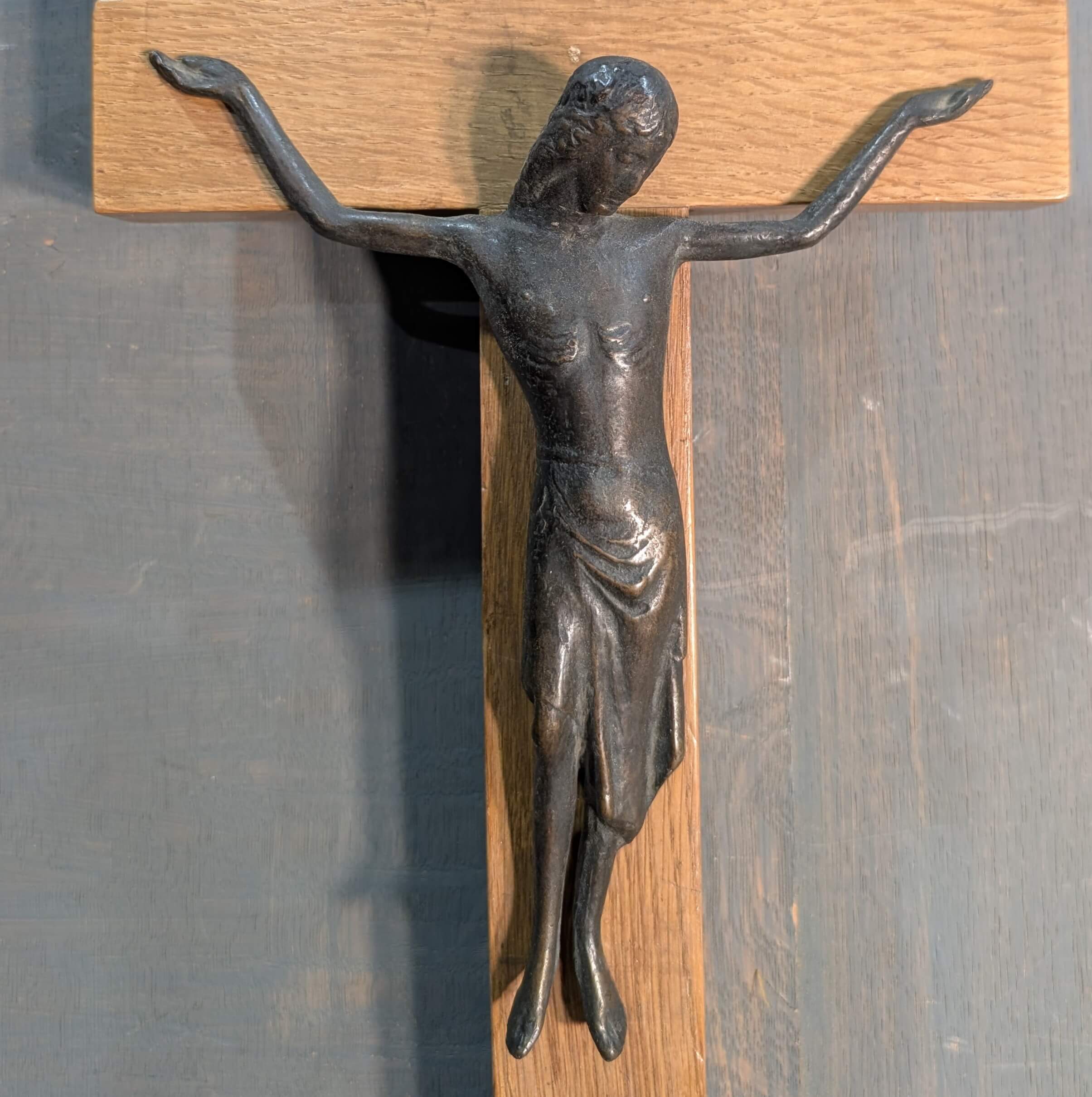 Striking Modernist Bronze & Oak Crucifix Circa 1965