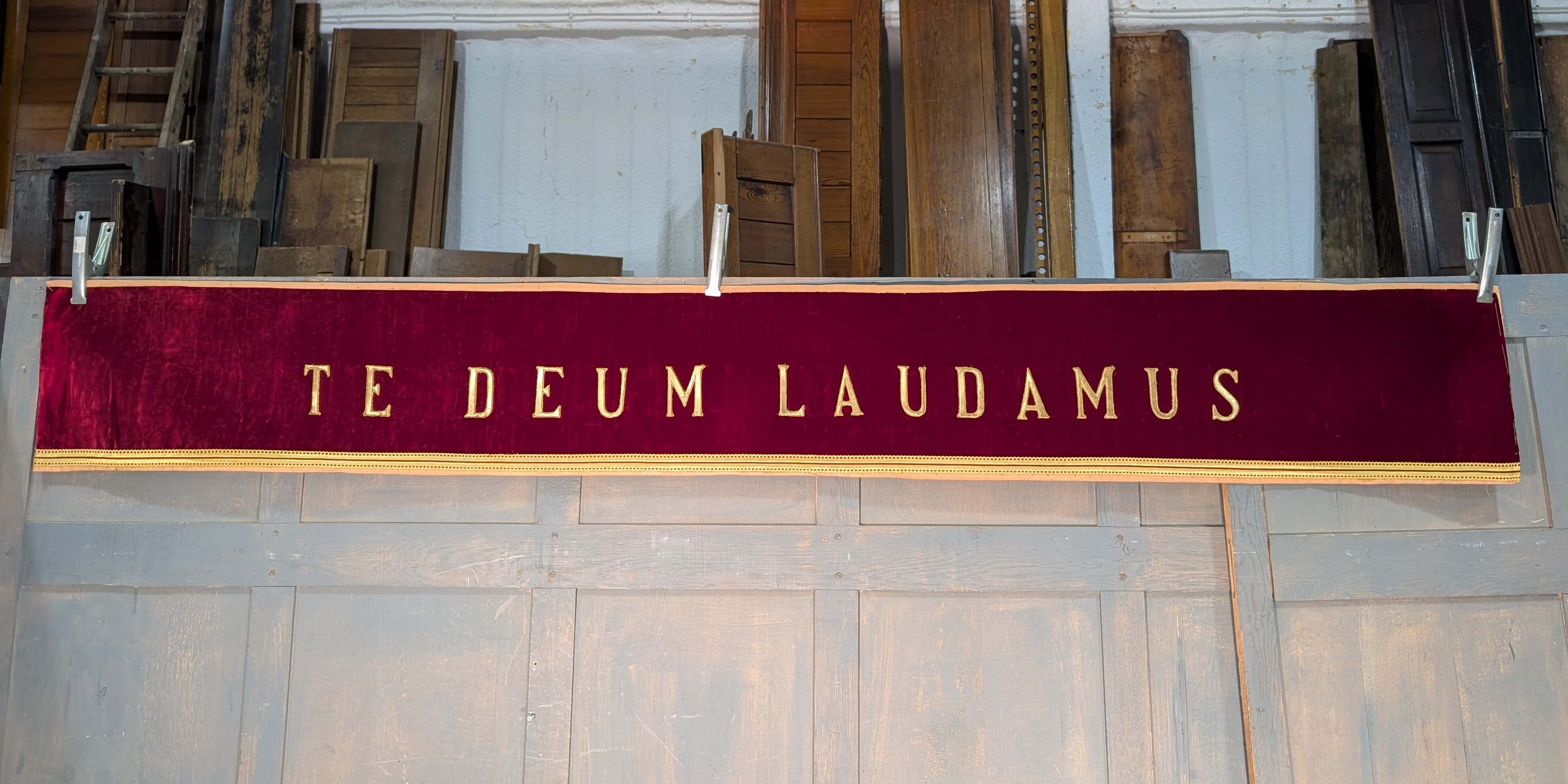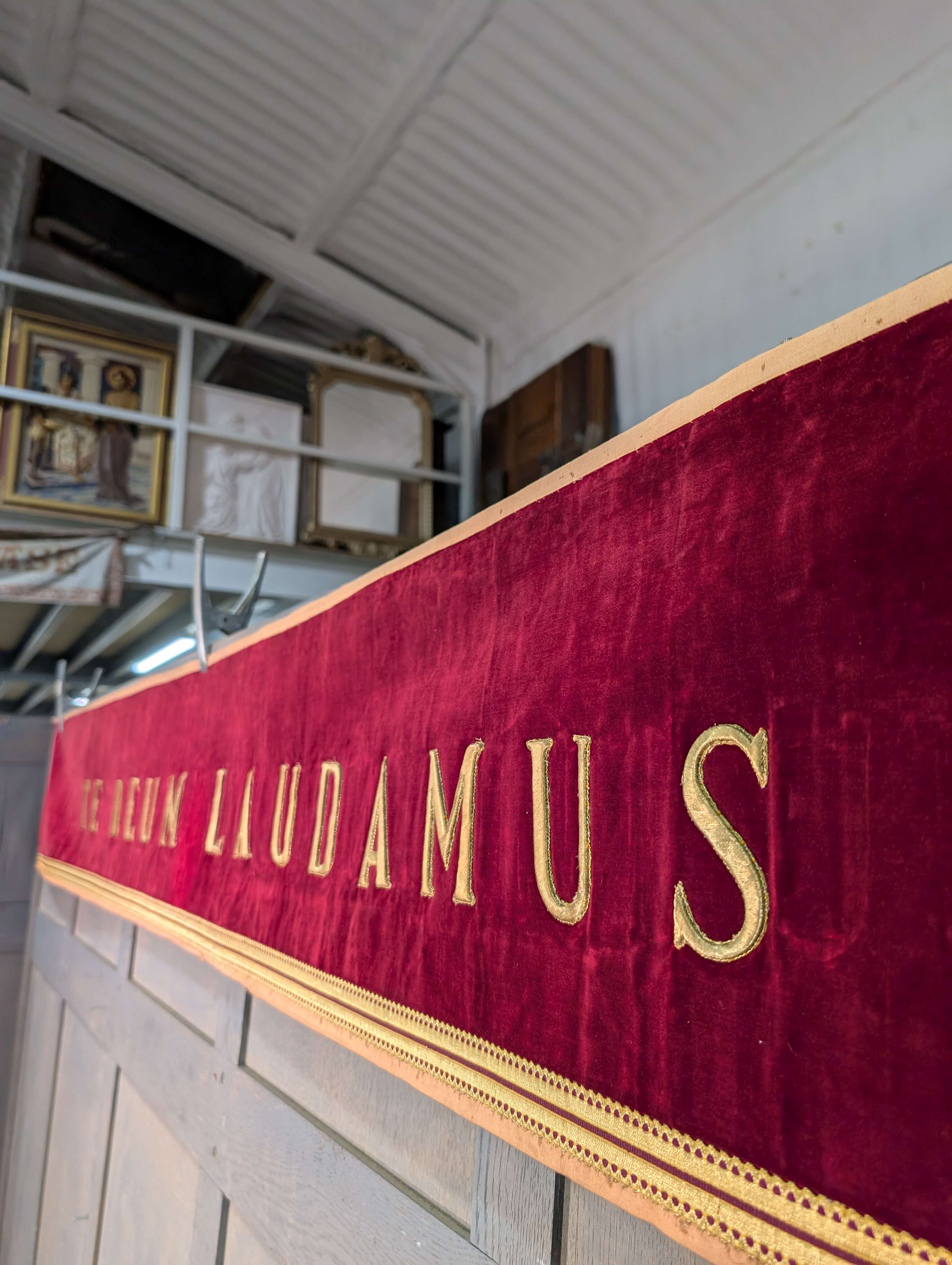 Our product shown on this page Te Deum Laudamus – Bullion Work on Velvet Banner is currently available for hire.