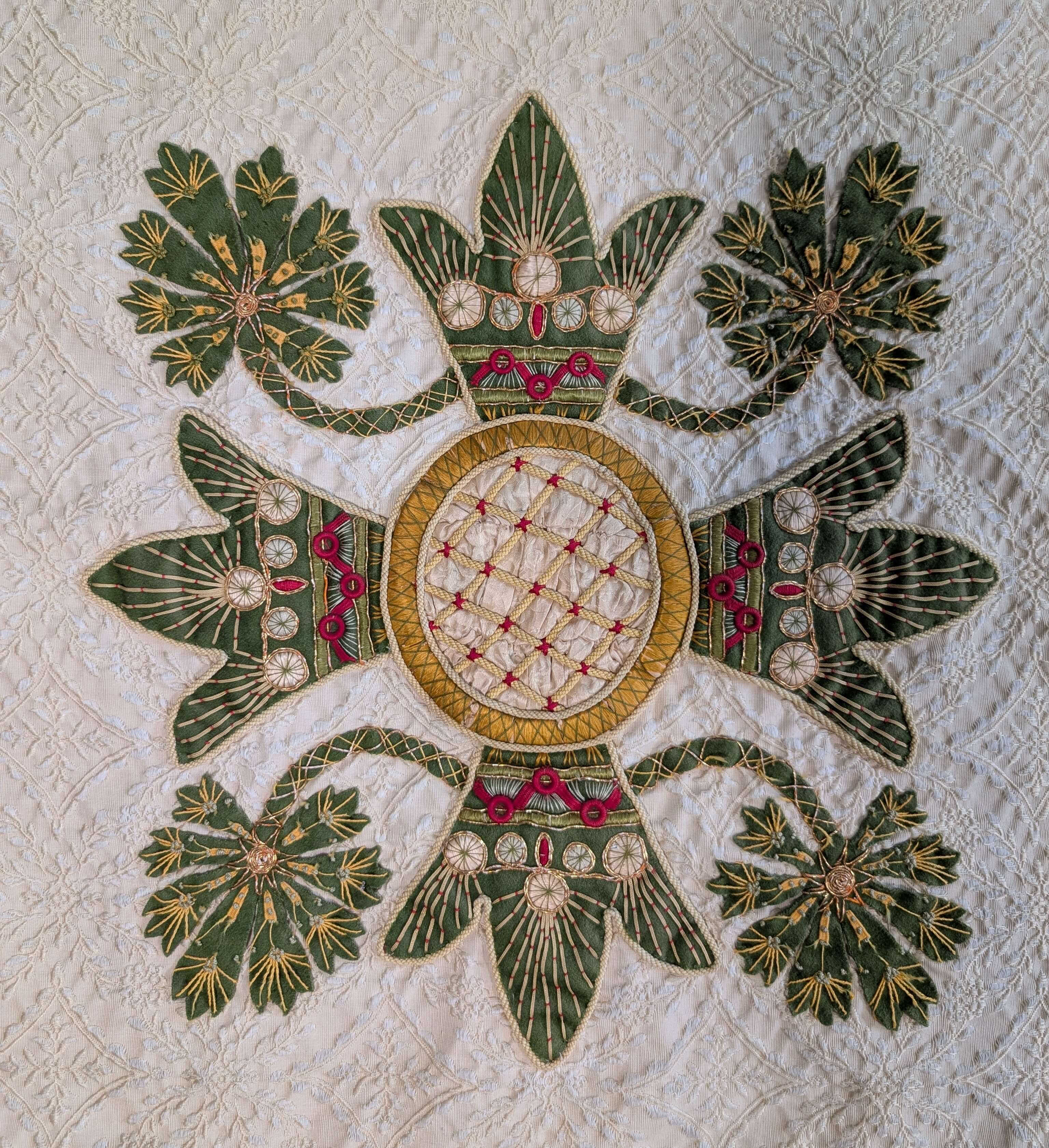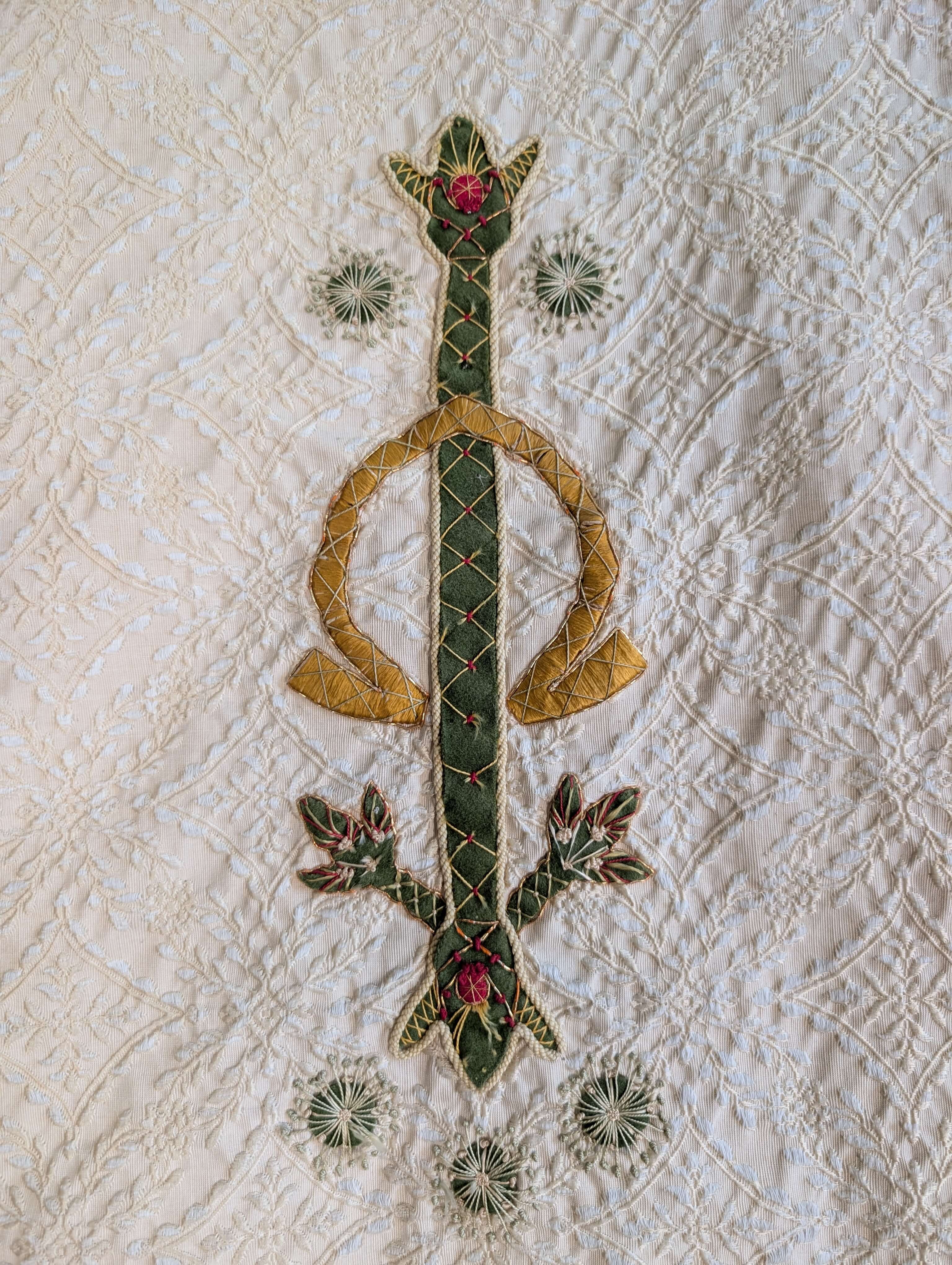 Delicate and unusual embroidery.  Mouse damage at left hand base.