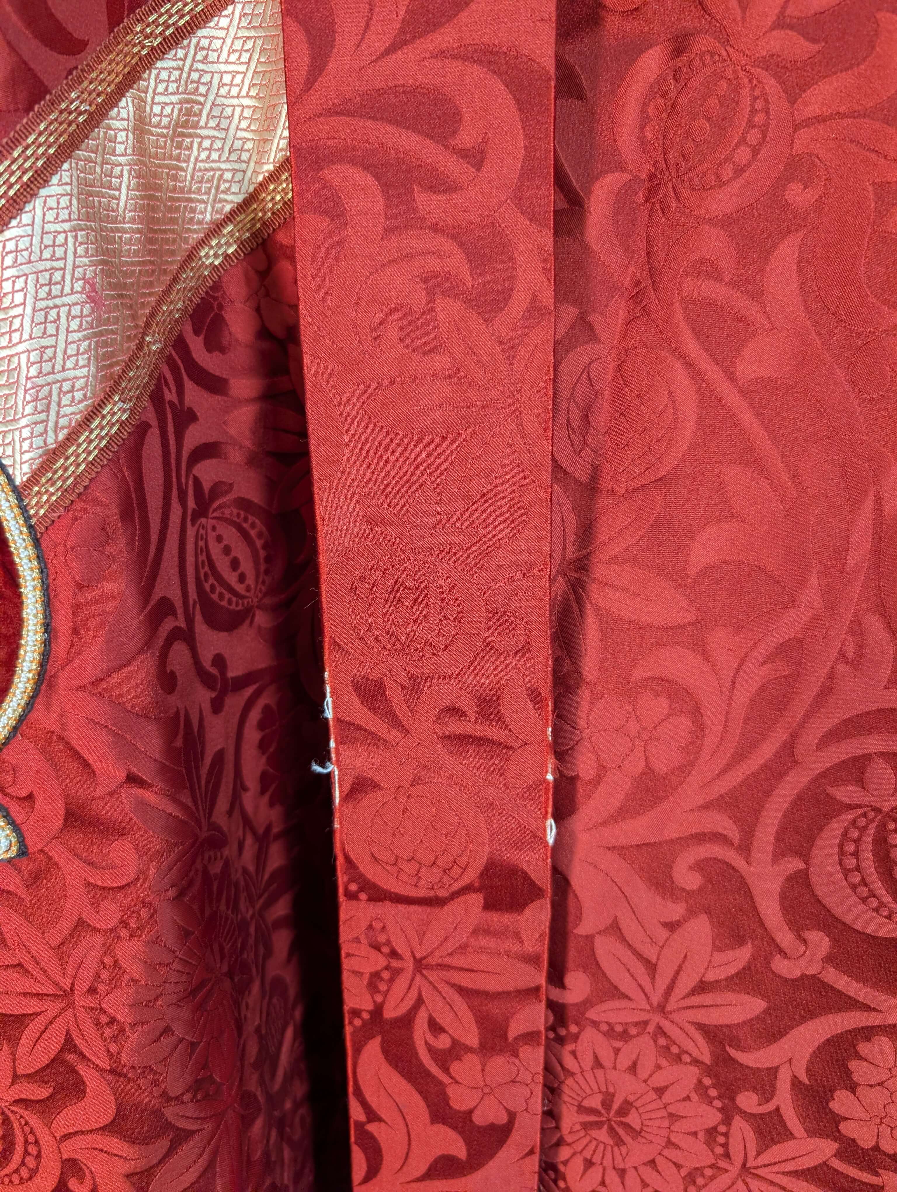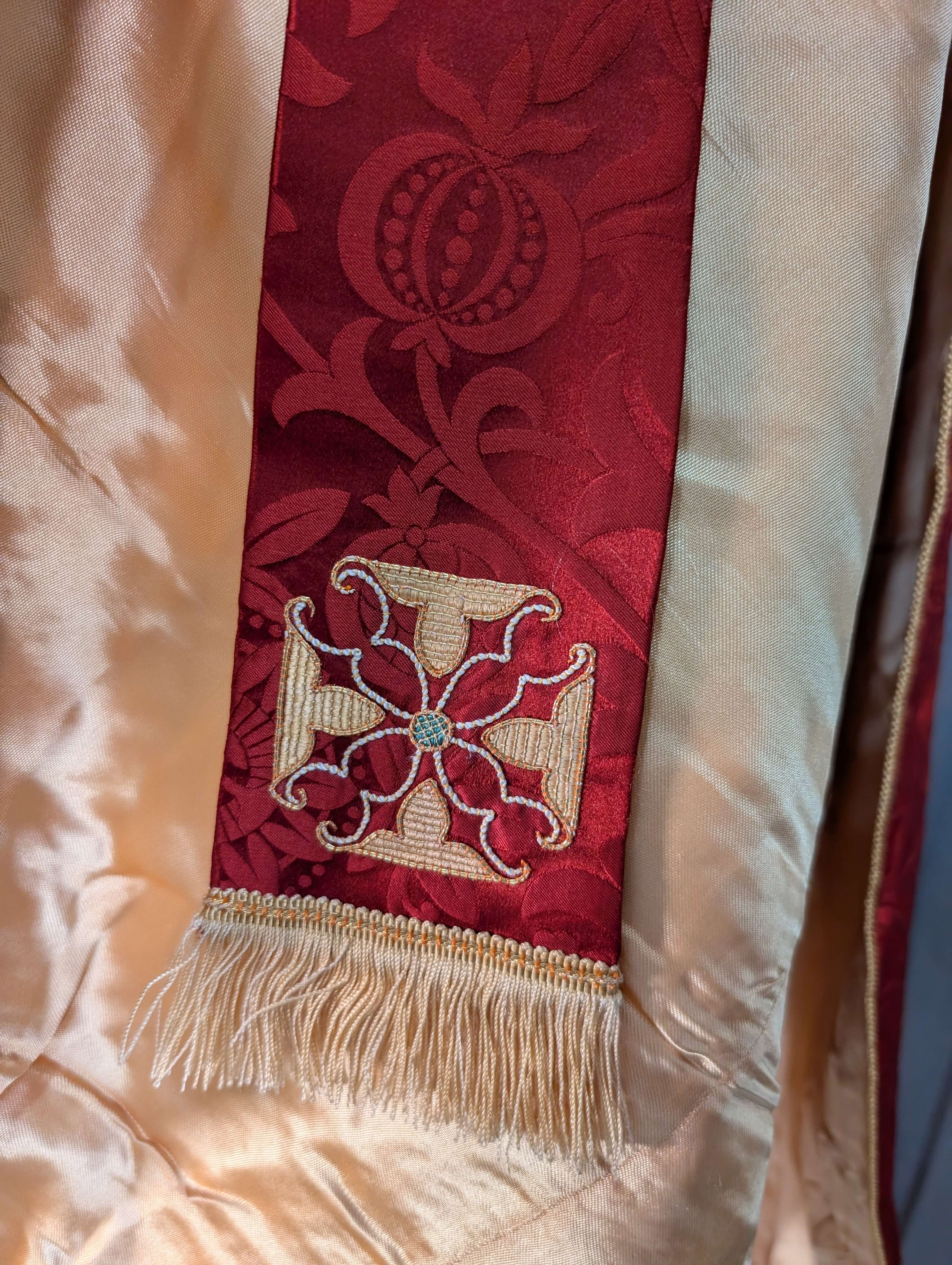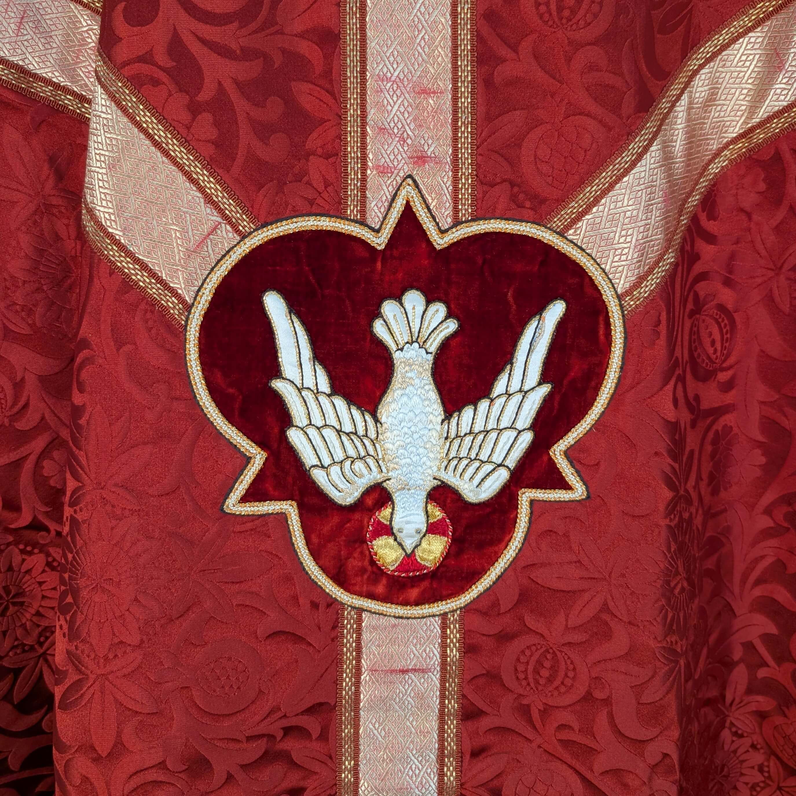 Our product shown on this page Vintage Carmine Damask Silk ‘Dove of Peace’ Chasuble with Stole – Project – is currently available for hire.
